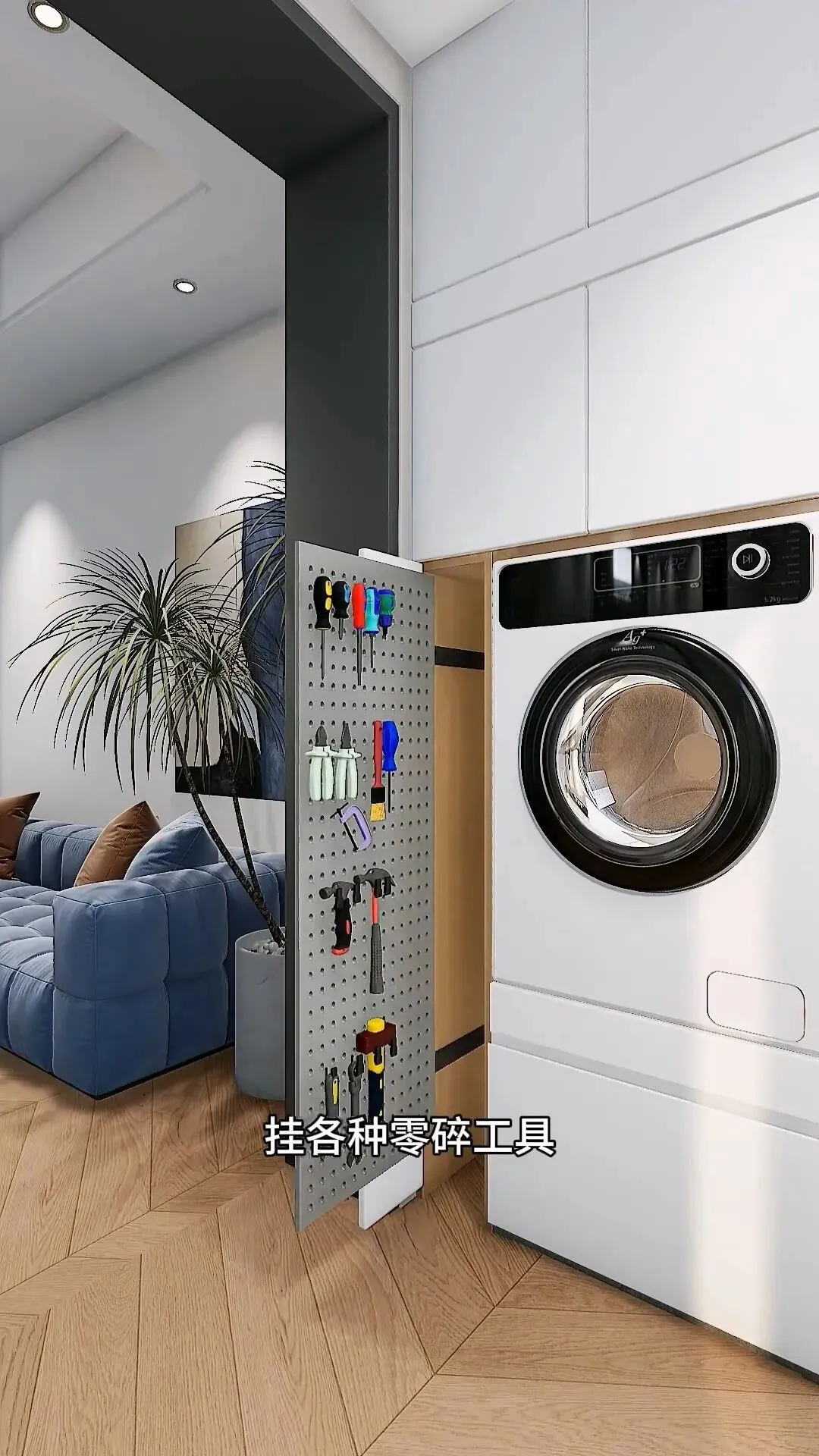 窄柜内侧暗藏侧拉动动板,各类小工具挂放有序。另一边加装一组开放格,洗衣用品随手可取,用着超方便。