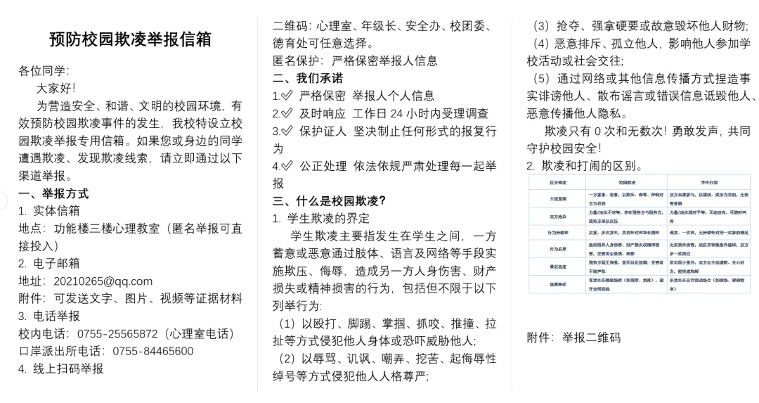 如果您察觉任何异常,或心存任何忧虑,请立即联系我们。您的关注与行动,至关重要。让我们携手并肩,对校园欺凌坚决说“不”!共同将我们的校园,建设成最阳光、最安全、最温暖的地方。