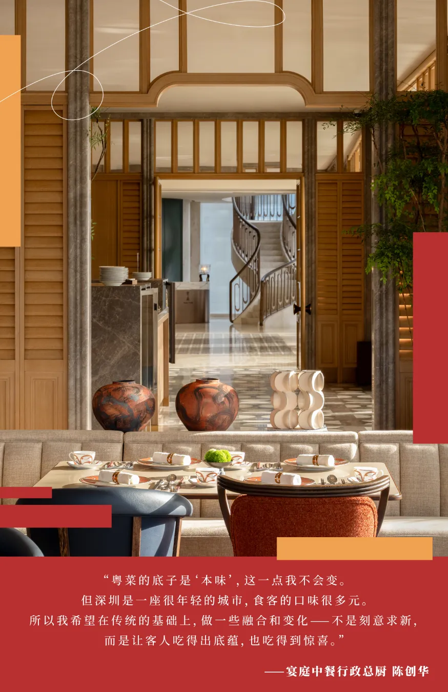 A:粤菜的底子是“本味”,这一点我不会变。但深圳是一座很年轻的城市,食客的口味很多元。所以我在宴庭做的,是在传统的基础上,用更好的食材、更合适的技法,做一些融合和变化——不是刻意求新,而是让客人吃得出底蕴,也吃得到惊喜。