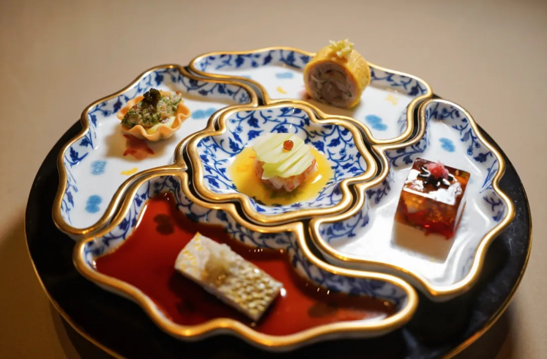 前菜「缤纷五重奏」以创新冷味技法开场,打破传统宴席的沉闷感。「沙姜油闽东壹鱼饭」、「金不换鸡汤西施舌冻」、「水果芹捞汁赤米虾」、「春沙葱冰皮巴马香鸡」、「脆盏椿芽豆腐春蚕豆」五款小品,清鲜爽利,为整场晚宴奠定春意盎然的基调。