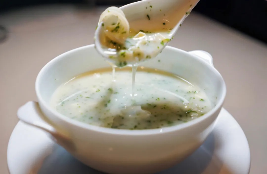随后呈上的「春蔬闽东壹鱼米花胶羹」,我用了春笋、荠菜这些时令春蔬,和黄鱼搭配,清清爽爽,是春天的味道。