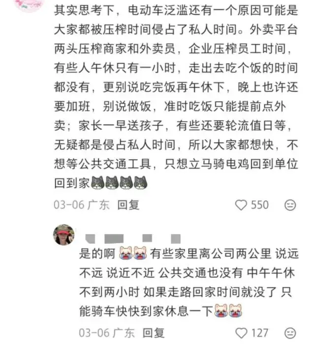 对于城中村通勤者、外卖骑手而言,电动车是地铁未覆盖区域“最后一公里”的工具,更是维系生计的依靠。有外卖小哥坦言,限行扩围会延长配送时间,而平台算法不调整,超时罚款可能让半天辛苦白费,违章实属无奈。