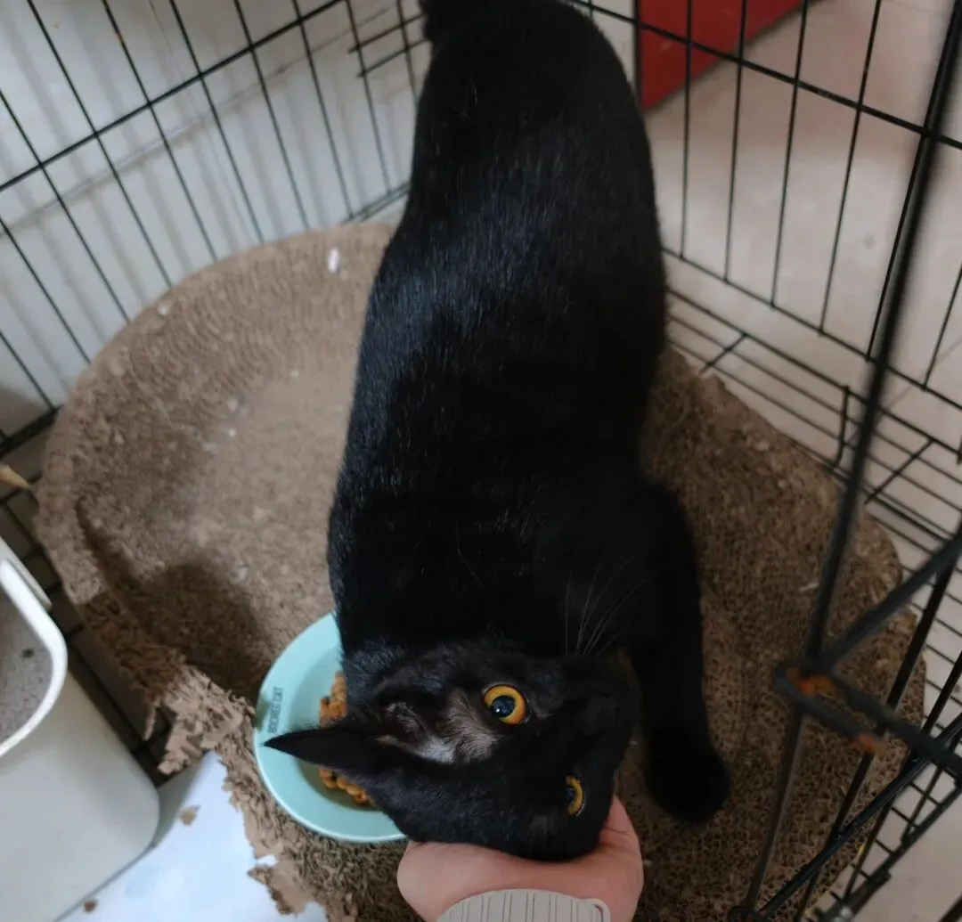 是来喂猫点排队蹭饭的小黑猫。全身黑的发亮的玄猫妹妹,又大又圆的橘色眼睛。毛发柔顺手感好,亲人粘人,喜欢被摸摸。未绝育,喜欢互动。目前七八个月大,身体健康。
