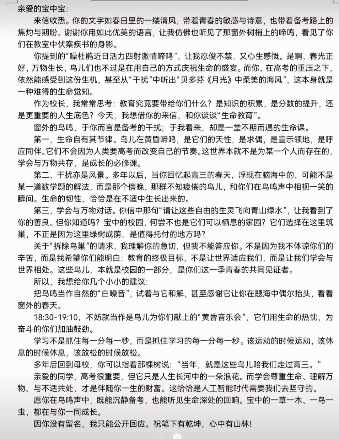 校长没有简单地答应或拒绝,而是给这位学生写了一封回信。信中,校长谈到了要学会尊重生命、与万物共处,这是一种人生巨大的财富。这封回信迅速在网上传开,大家纷纷点赞校长的格局和教育智慧。