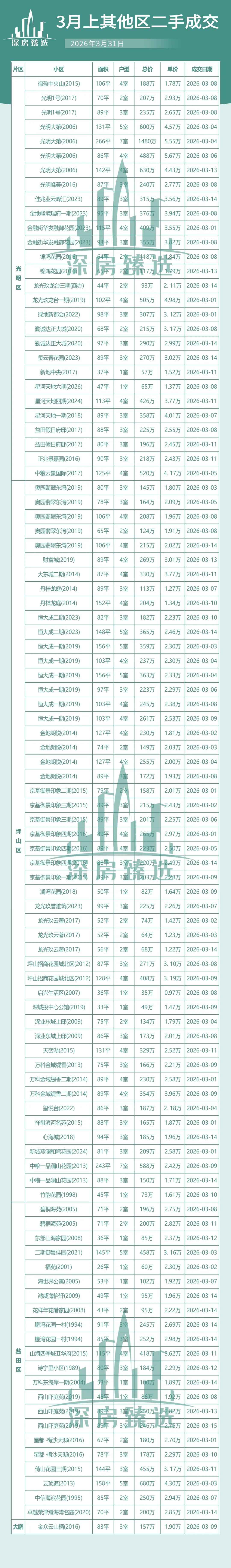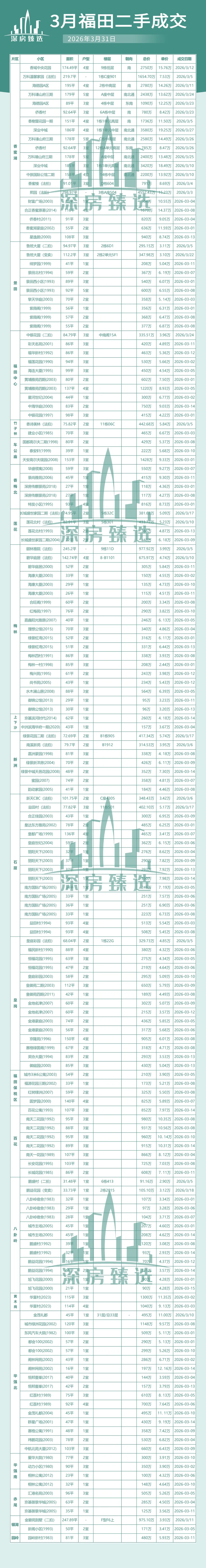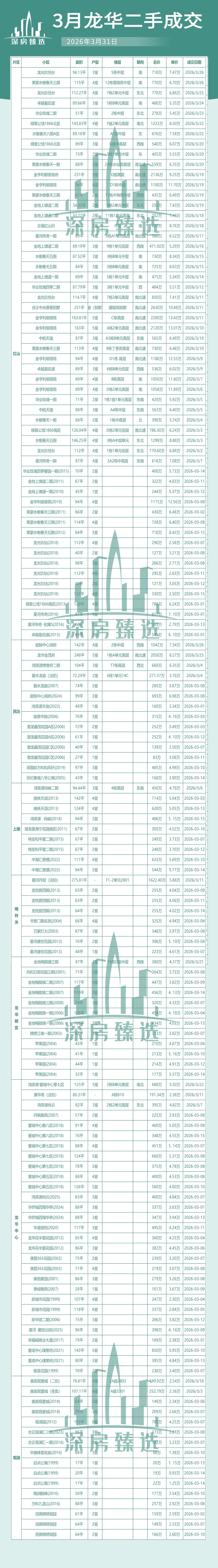 今天给大家整理了深圳3月全市的二手房成交数据(包括部分法拍房),粗略计算大概有1300多条成交,数据基本是最新也是最全的。