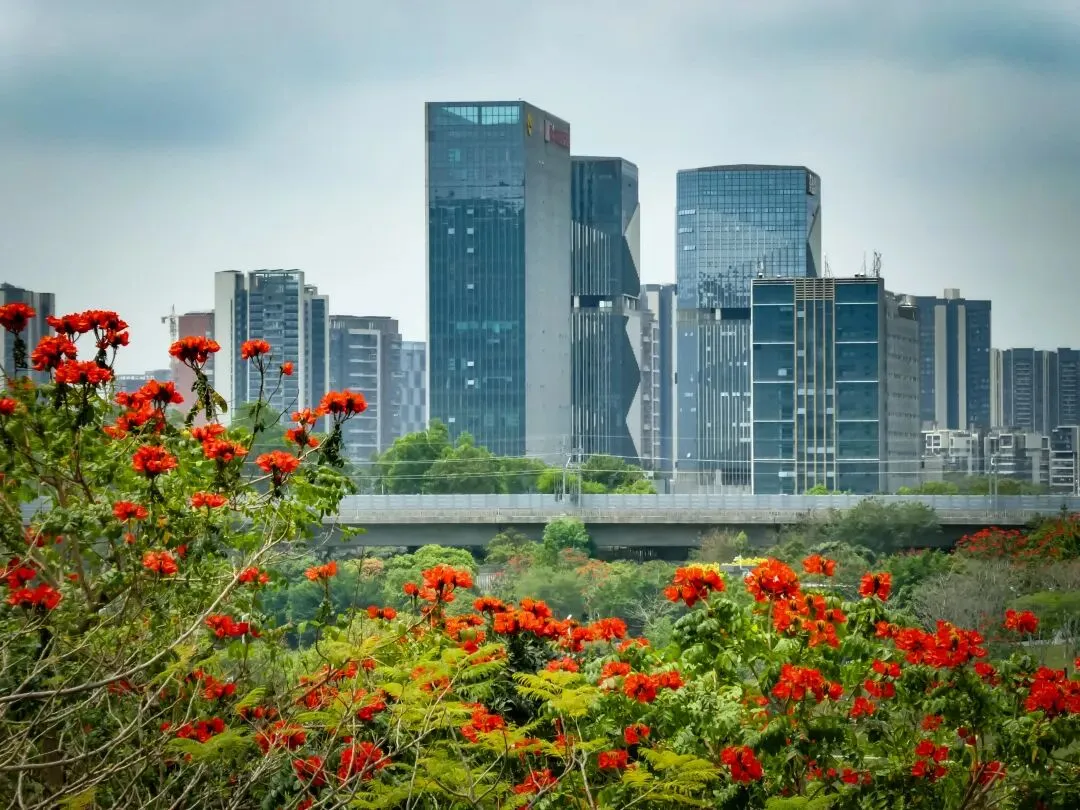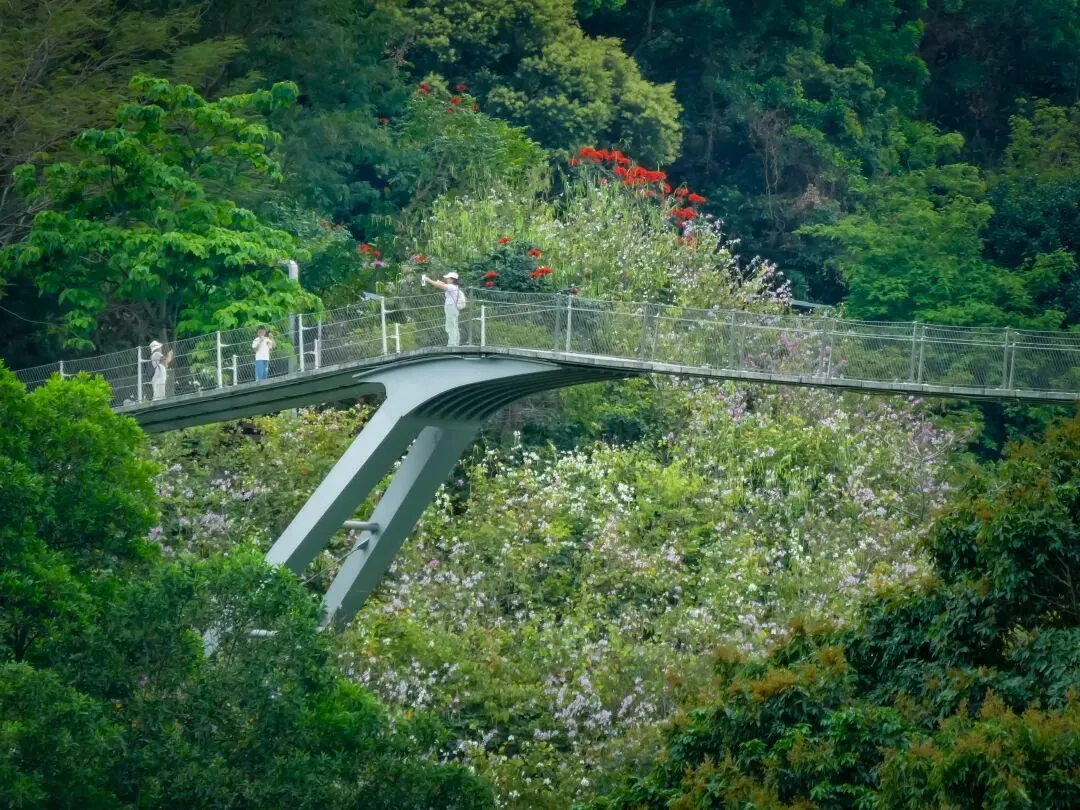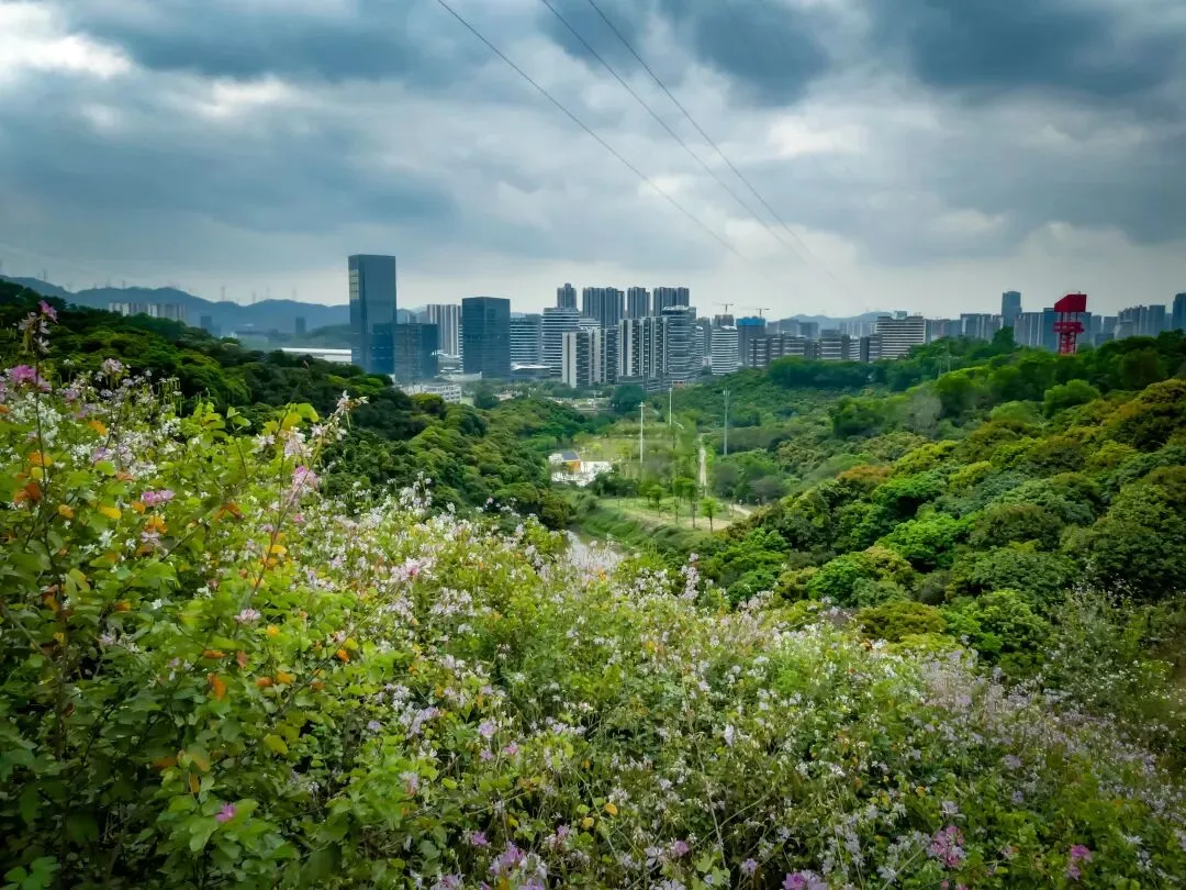 从日熹阁下来,正式踏上红桥步道。行走数百米,步道旁几十株火焰花正值盛花期,火红的花簇热烈绽放,与远处光明城区的“钢铁丛林”形成鲜明对比,按下快门就能解锁“自然野趣撞入现代都市”的独特画面。