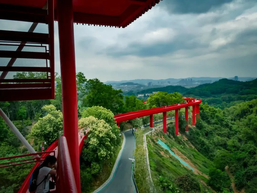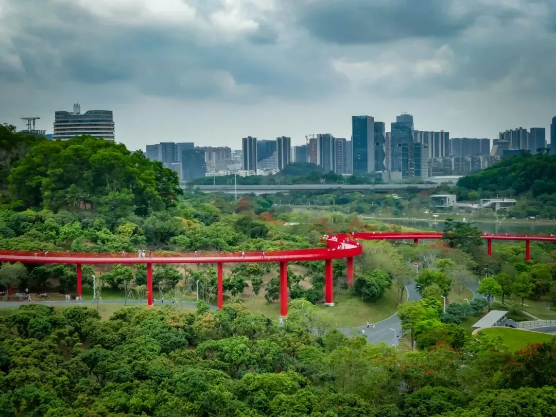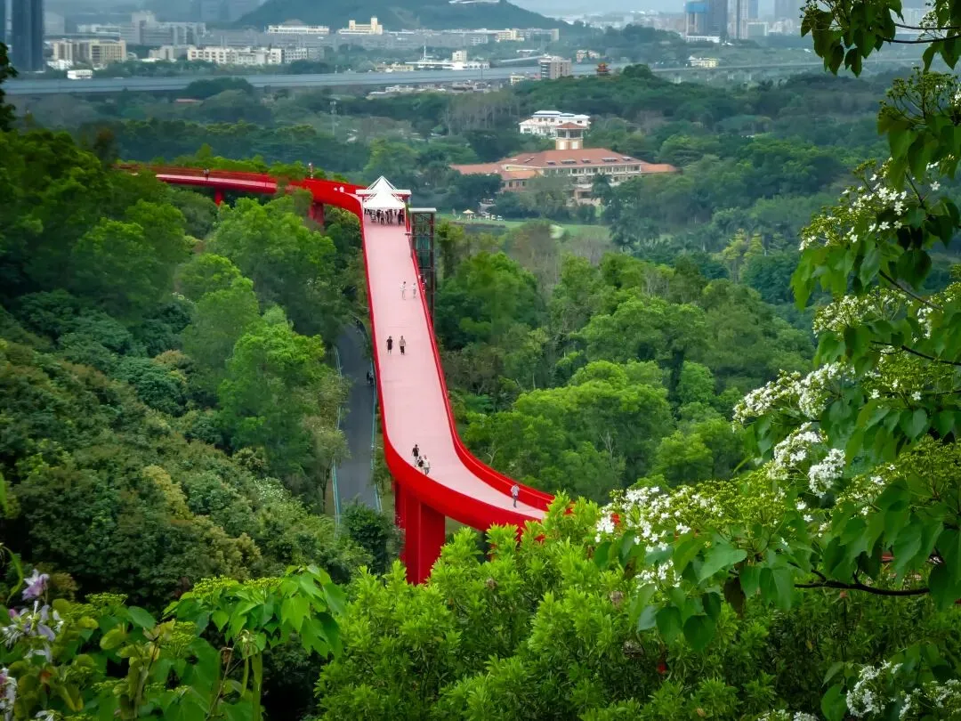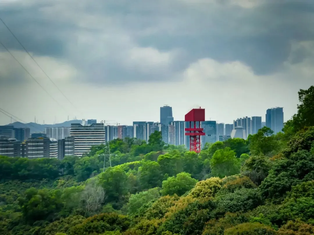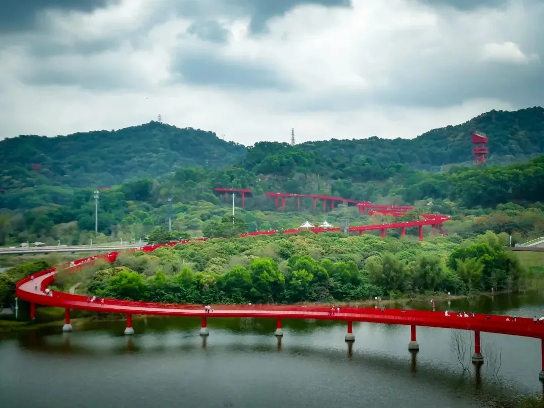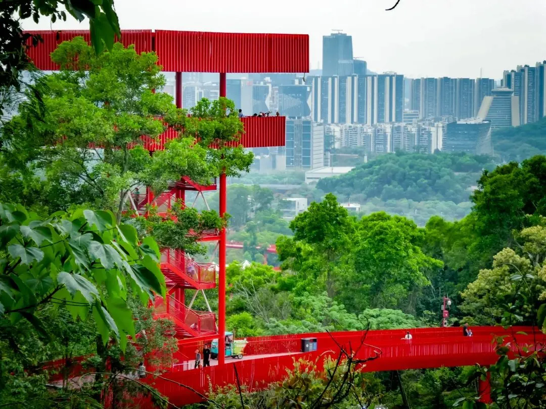 登上塔顶,红桥全景尽收眼底,它如一条红色游龙,穿行于漫山绿意之中,远方则是光明新区的城市轮廓。此情此景,方知深圳不仅有速度,更有藏于山野的温柔。