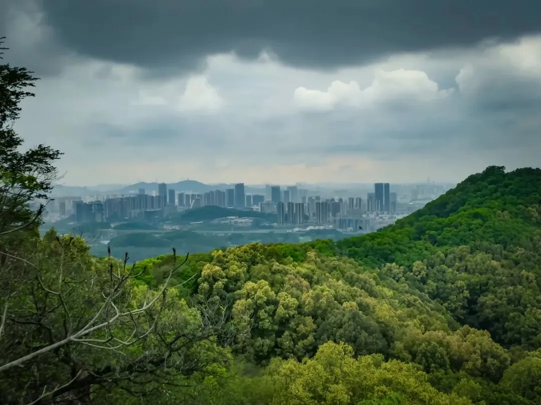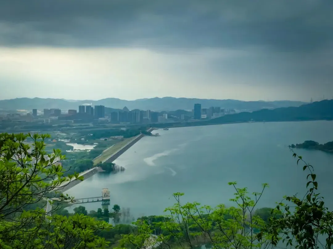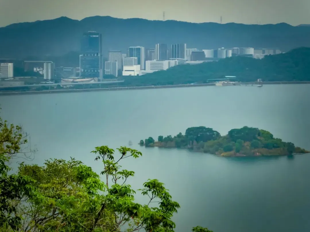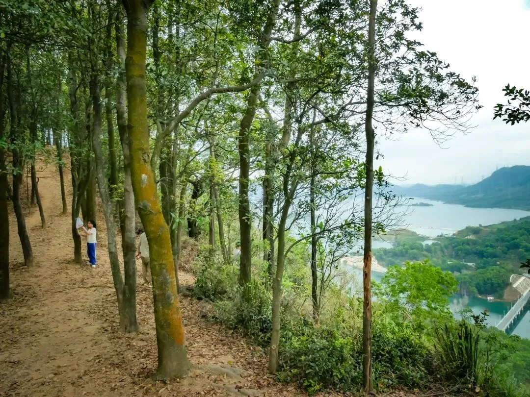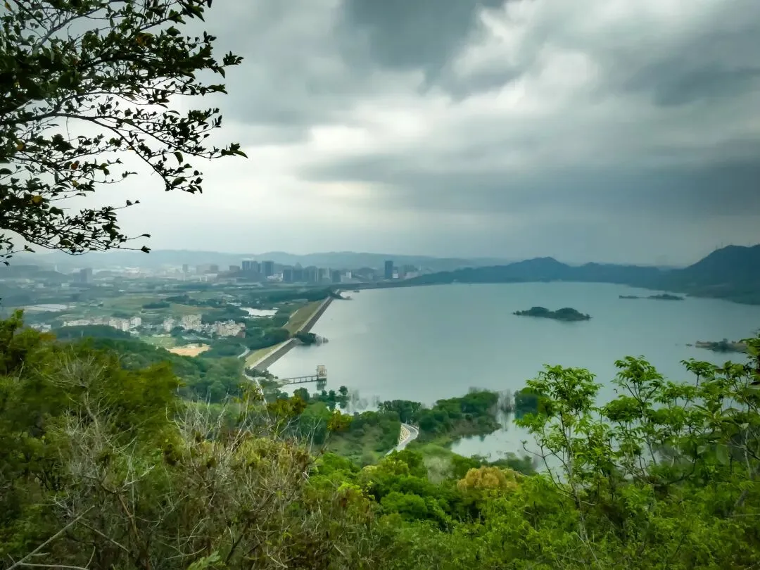 徒步约11公里,目的地蠄蜍石终于出现在眼前。这是一处高耸的石崖,站在其上,整个光明湖水库的壮丽景色一览无余。水库像一块巨大的、温润的翡翠,镶嵌在城市与群山之间,远处的楼宇在薄雾中若隐若现,画面宁静而富有诗意。这里不愧是网红打卡点,出片率极高。