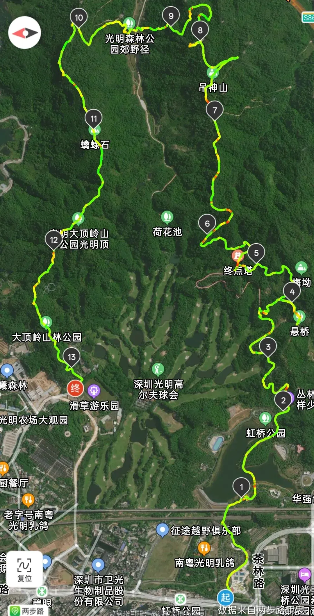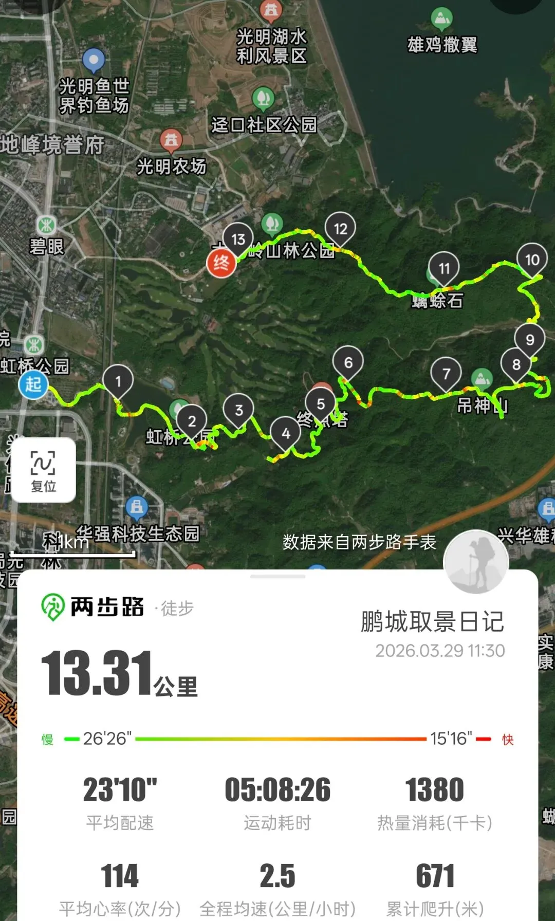 最终,从光明滑草场步行至碧眼地铁站A口,结束全程。运动手表记录:徒步13.31公里。身体虽略感疲惫,但心中满是探索的满足。虹桥的红,悬桥的花,吊神山的野,蠄蜍石的阔,都留在了这个阴天的周末记忆里。大顶岭这片宝藏之地,还有太多未涉足的角落,下次再来,继续探索。