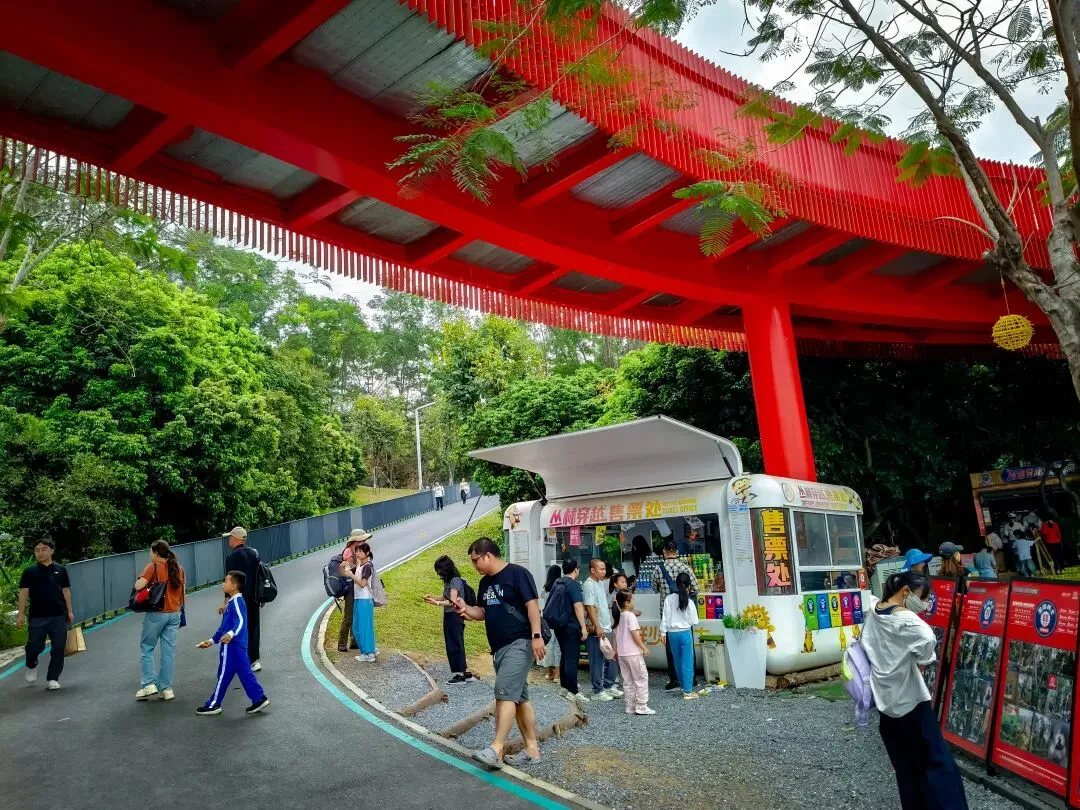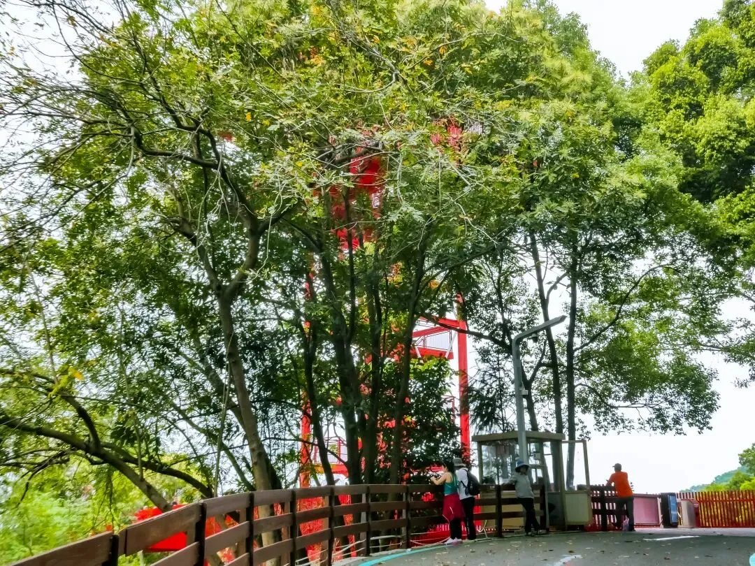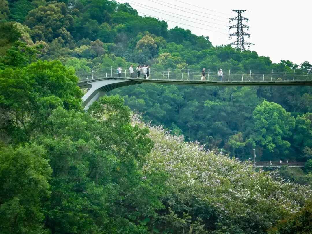 全程徒步约2.7公里,红桥已升至半山高度。回望来路,红色的桥身在无边的绿意中曲折延伸,一头牵着山林的静谧幽深,一头系着城市的繁华喧嚣,意境十足。