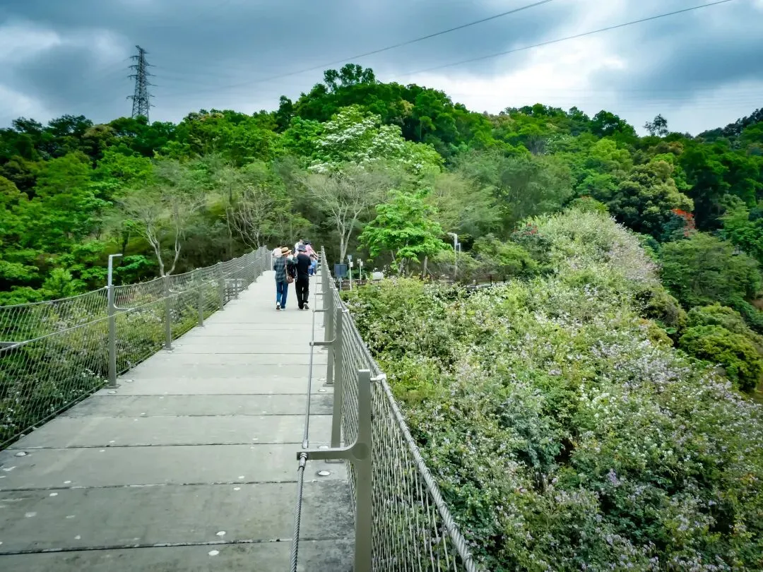 来到悬桥,视野极为开阔。桥下一整面山坡都开满了宫粉羊蹄甲,虽部分已开始凋谢,但依旧成片烂漫,如烟似霞。站在桥中央,脚下是绿意盎然的山谷,远处可瞥见光明区的高楼群,风景层次丰富。在大顶岭绿道看到导游图,发现这片区还有很多可探索的景点,一天是肯定逛不完的。若要去吊神山,就得错过荷花池、浮桥、探桥那条路线了。
