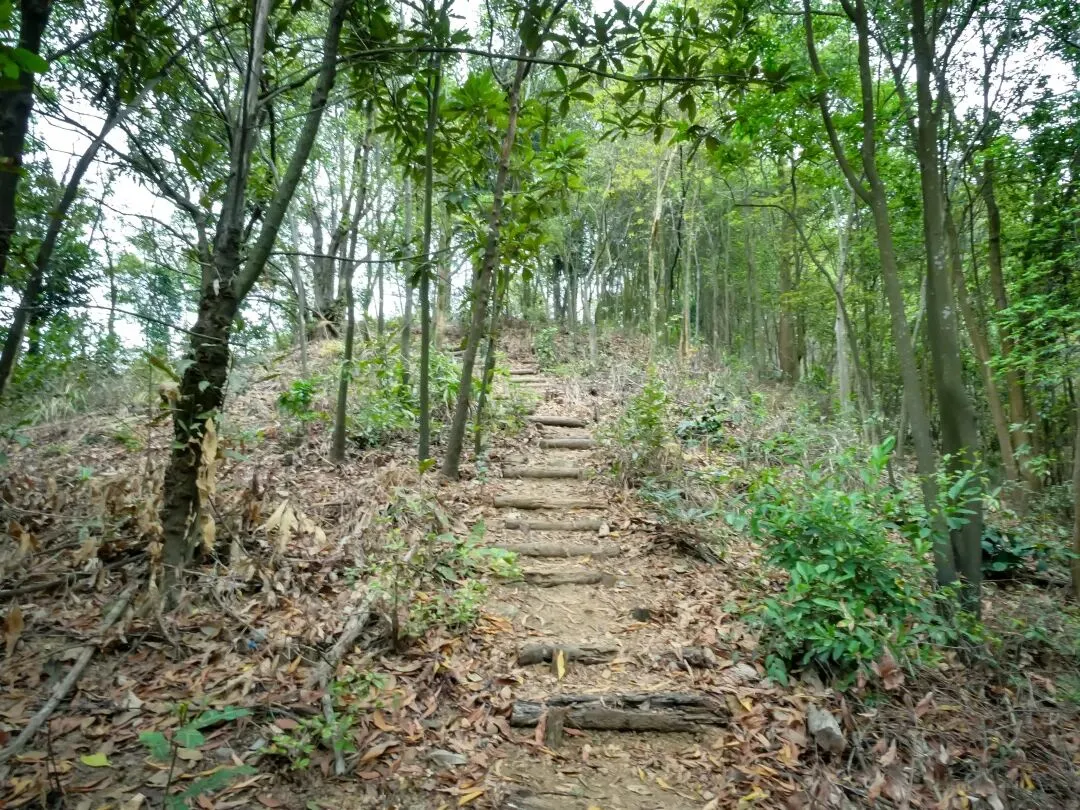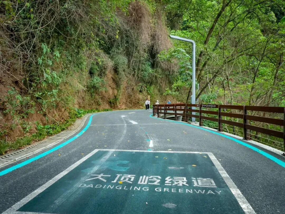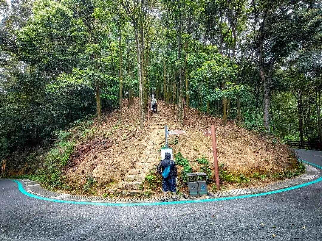 从终点塔旁,大顶岭绿道徒步约0.8公里,正式切入土路。路牌指向“梅坳”“郊野径”,一条向上的手作步道引领着方向,意味着更具野趣的徒步开始了。
