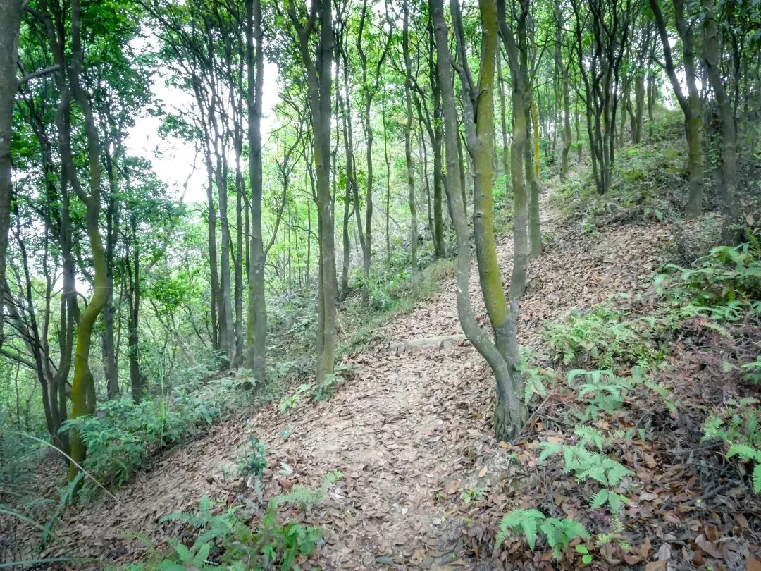 从大顶岭绿道转入山野土路,开始了约2公里的山脊线穿越,上坡下坡,穿梭于密林之中。然而,这与出发前的想象大相径庭——本以为山脊线上会有开阔的视野,结果一路几乎都在密林里穿行,风景寥寥。