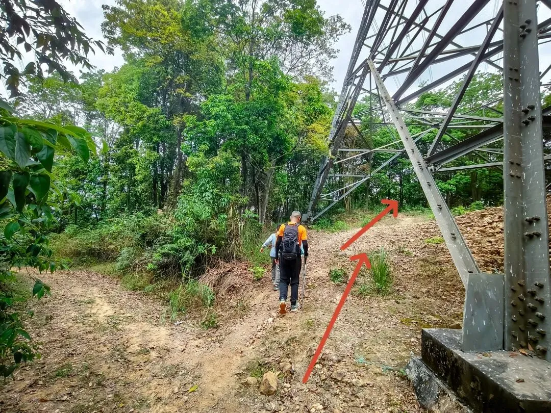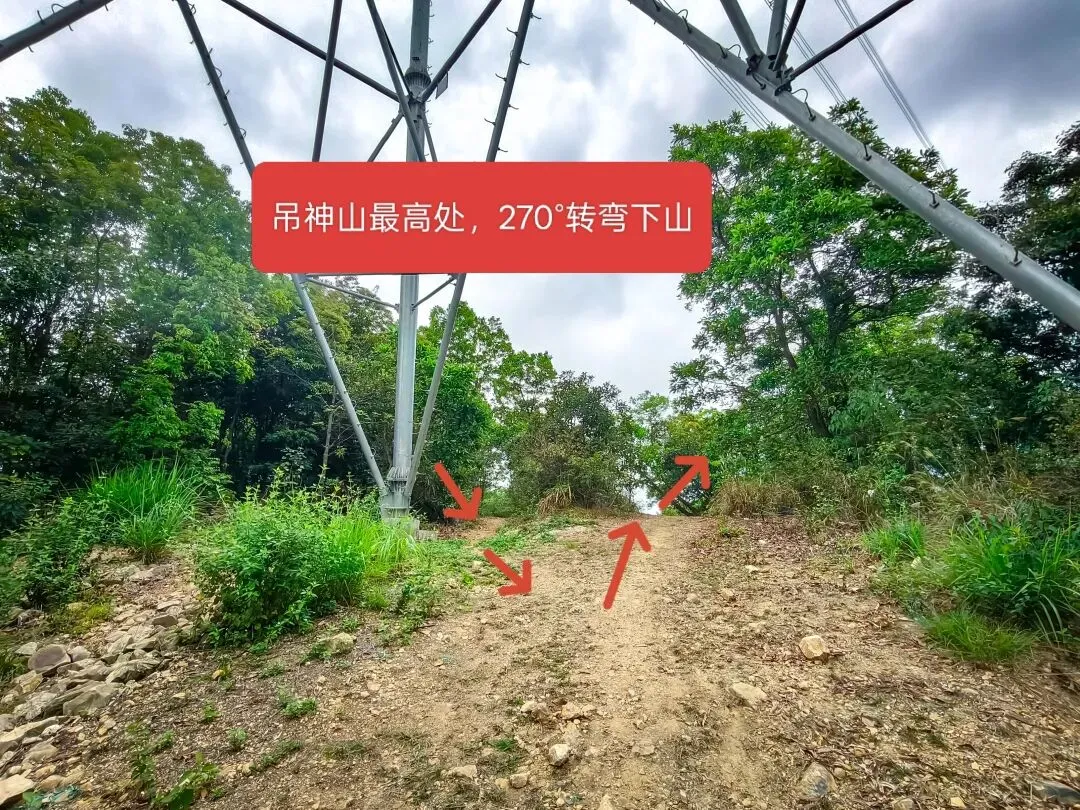 从吊神山下山,走1-200米电线塔处有个分岔路口,向右走。