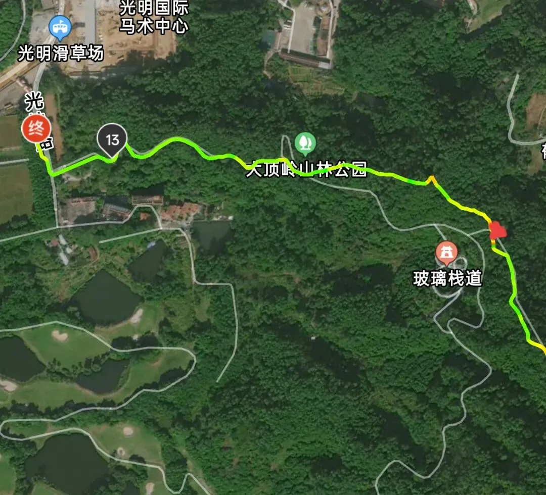 从蠄蜍石打卡完毕,便向光明滑草场方向下山。先是一段土路下坡,行走100多米后切入台阶,接着又汇入宽敞的大顶岭绿道。我在分岔路口错过“玻璃栈道”景点,我走的台阶路,后来发现通往玻璃栈道的路也是相通的。所以,到了分岔路口的时候,一定要有放大地图查看路线的习惯。😭