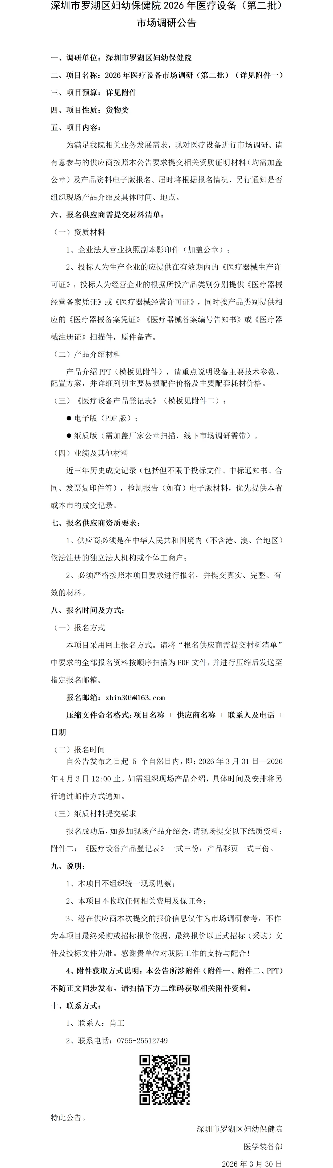 >深圳市罗湖区妇幼保健院2026年医疗设备(第二批)市场调研公告