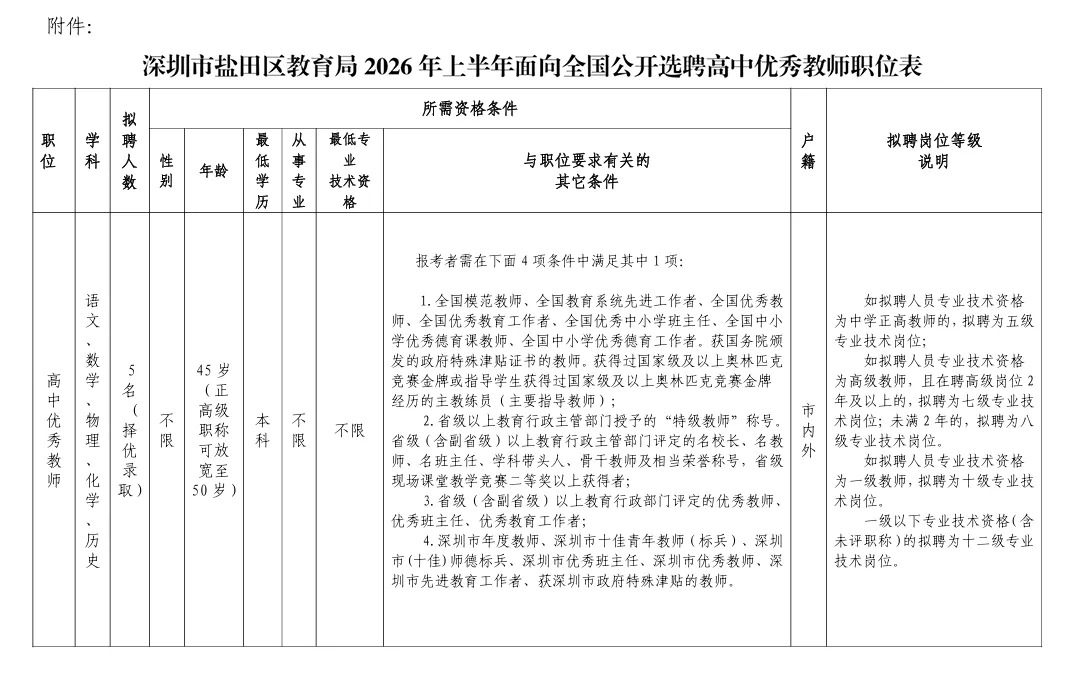 深圳市盐田区教育局区属高中专业技术岗位教师若干名,具体岗位条件见《深圳市盐田区教育局2026年上半年面向全国选聘高中优秀教师职位表》(附件)。