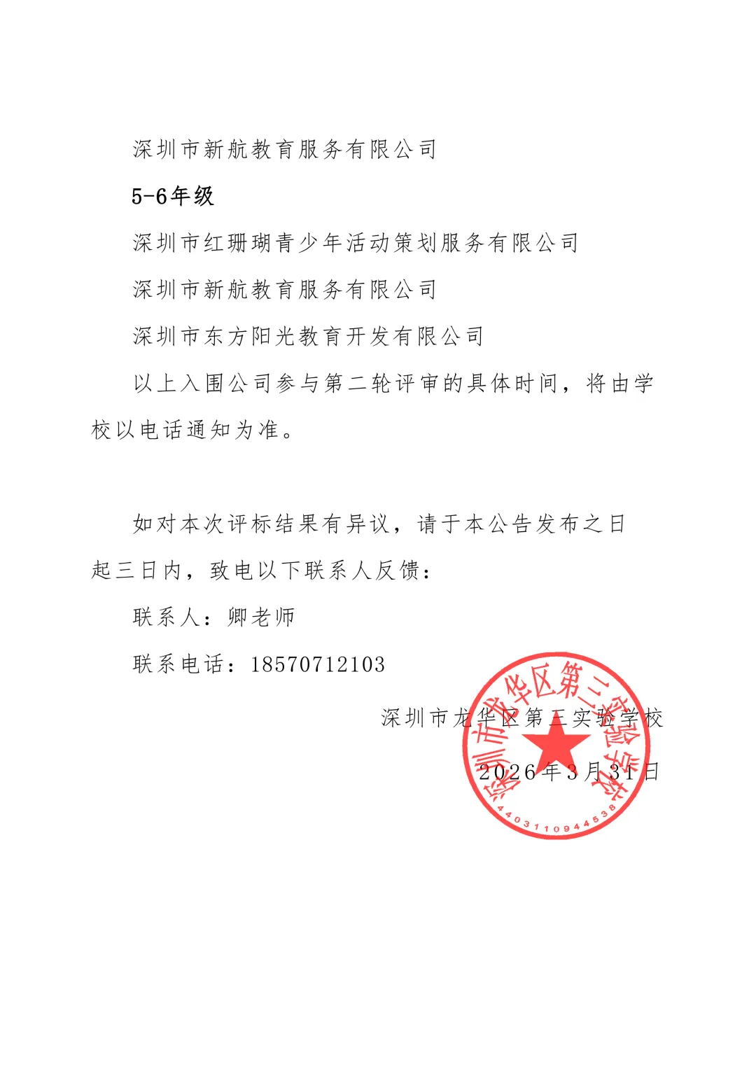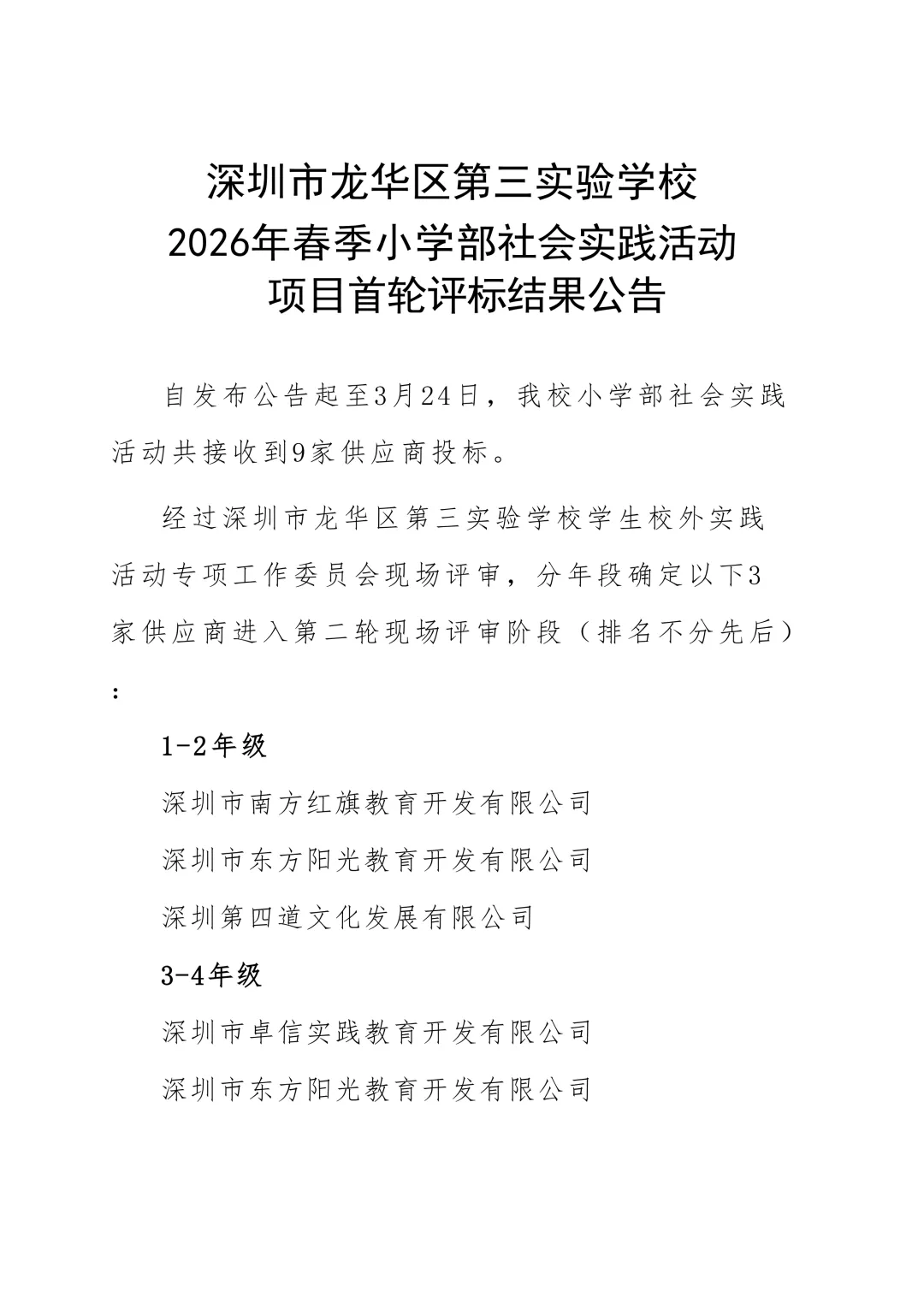 >深圳市龙华区第三实验学校2026年春季小学部社会实践活动项目首轮评标结果公告