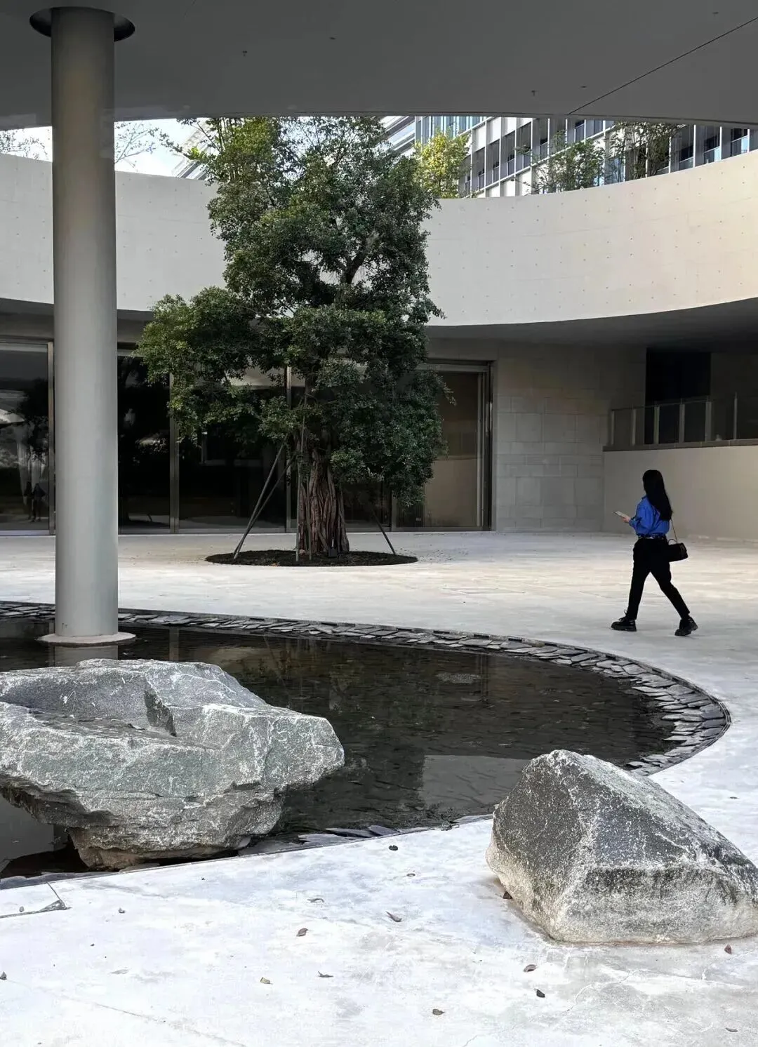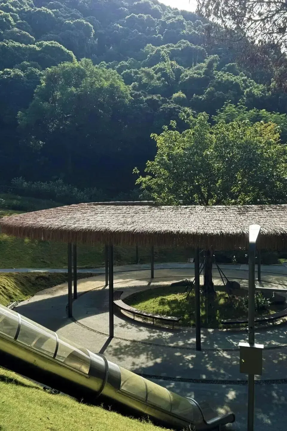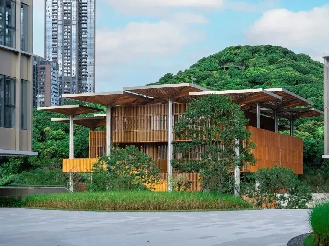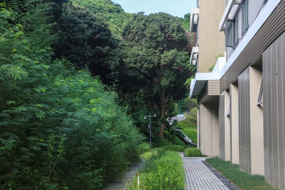 马蹄石、石子混凝土、砂基透水砖、高耐竹木及回收荔枝木……这些自然材质的运用,让建筑悄然融入山林,一点都不突兀。走在上面,你能感受到那种温润的质感,那是属于深圳特有的岭南生态美学。