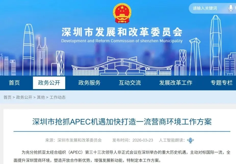 3月24日消息,深圳市发展改革委对外发布《深圳市抢抓APEC机遇加快打造一流营商环境工作方案》,围绕“服务APEC、提升软实力、释放长效益”核心目标,聚焦在深港澳和外籍人员及各类经营主体关切,在跨境人员往来、国际商贸物流、资金跨境流通、数据跨境流动、营商氛围营造等5个方面提出21条重点任务,持续推进深圳营商环境向更高水平迈进。