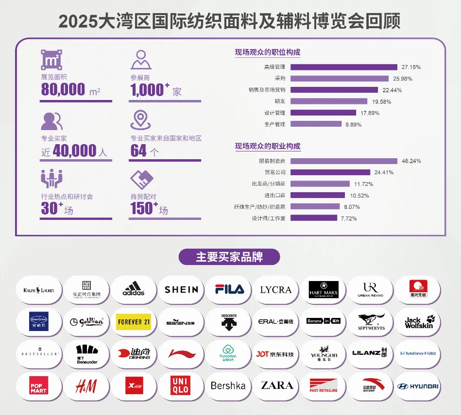 作为当前中国开放程度最高、经济活力最强的区域之一,2025年粤港澳大湾区经济总量突破14万亿元,“深圳-香港-广州”创新集群首次跃居全球第一。2026年,大湾区将继续彰显活力与韧性,为纺织产业的发展带来确定性机遇。对于企业而言,参展就是抢占先机: