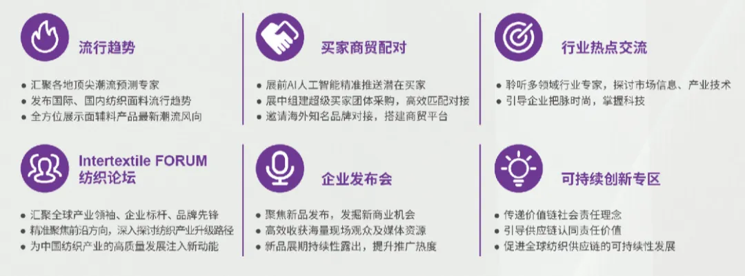 2026Intertextile大湾区面辅料展现场,将想市场所想、急产业所急,用心打造流行趋势、行业热点交流、纺织论坛、企业发布会、买家商贸配对等精彩活动。无论是想要聆听吸收知识干货,寻找未来发展方向的展商及专业买家,还是想要通过商贸配对获得更好的商贸成效的供需企业代表,都将在这些活动中有所收获。