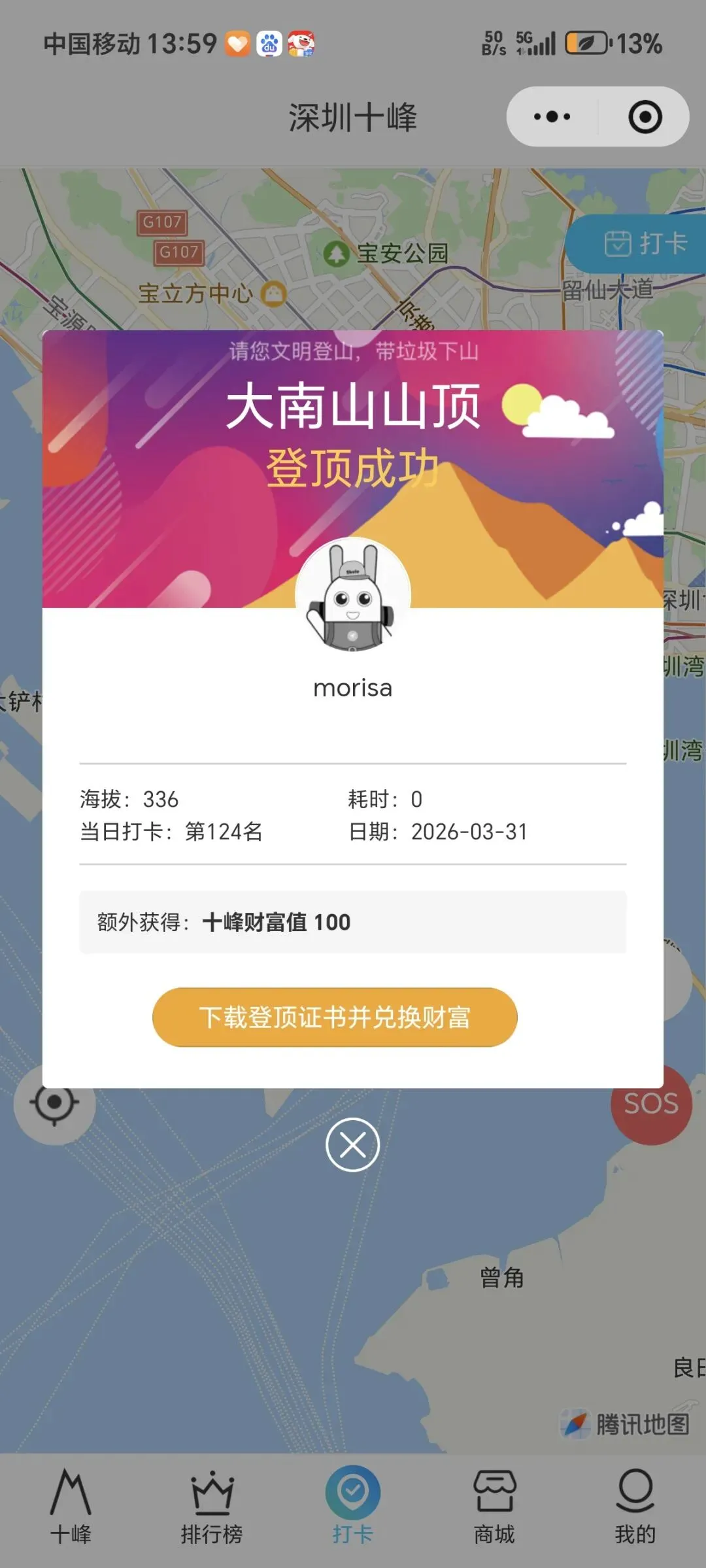 到了山顶打卡的时候,我瞄了一眼排名,124。工作日加上天气不好,来的人果然少。要是搁在周末,这个点怕是早就被挤到几百名开外了。124这个数字,倒正合了这“独行”的意境。