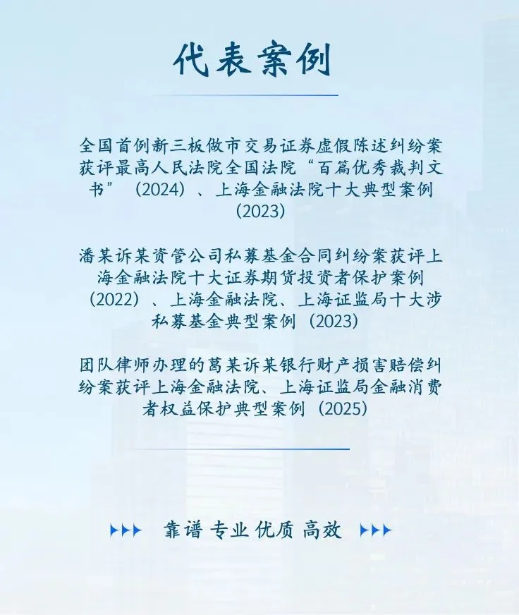 法学硕士,具有十余年法律工作经验,曾任职于上海市某区法院及金融法院,专业从事金融案件审判工作,擅长处理疑难、复杂的金融商事争议案件,主要涉证券虚假陈述责任纠纷、融资租赁、保理、保险、信托、私募基金、金融借款、资管纠纷、期货纠纷、重大股权纠纷、对赌协议纠纷等,以及擅长处理疑难复杂金融及商事仲裁案件。从事法律服务工作后,为多家金融机构、上市公司及高净值客户提供优质高效法律服务,获得客户高度认可。