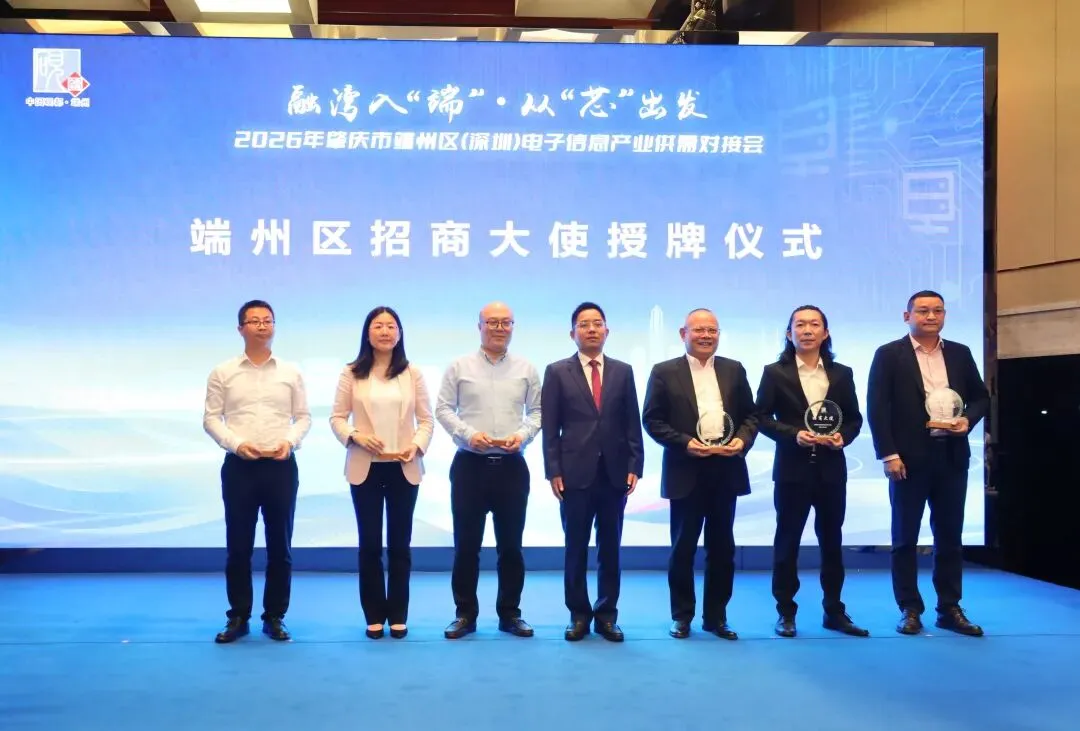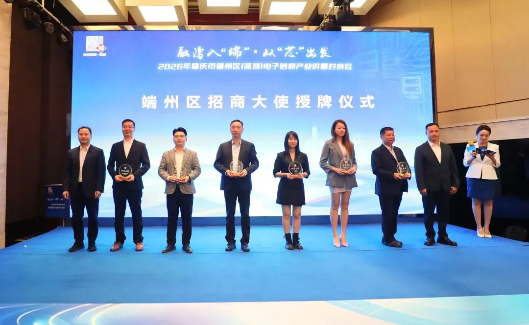 活动还举行了“端州区招商大使”授牌仪式,12位来自商会、企业、行业协会的代表获此殊荣,他们将发挥资源优势与行业影响力,为端州精准链接更多优质产业项目、高端人才与前沿技术,全力助力当地电子信息产业链强链、补链、延链,推动产业集群提质升级。