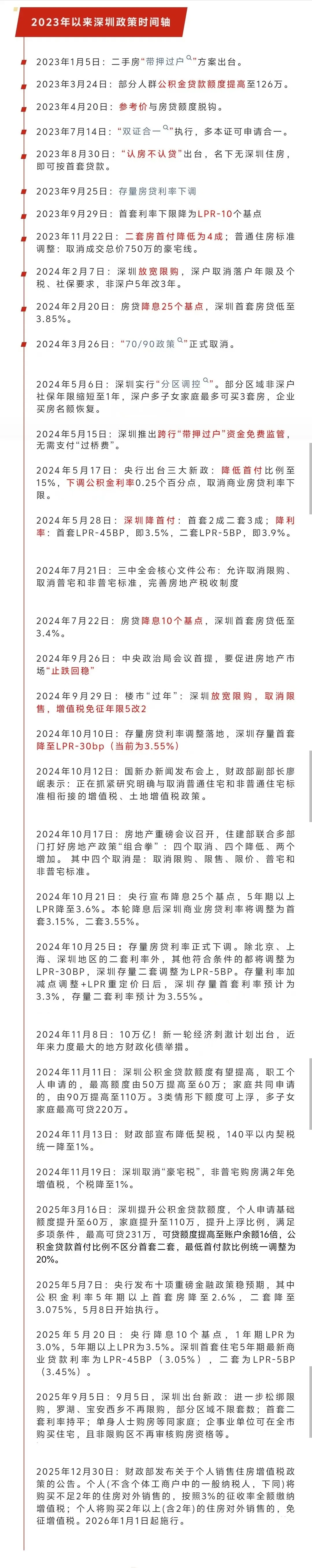 点蓝色字关注”言明深惠“2023年以来,深圳楼市的政策工具箱经历了一场波澜壮阔的“大释放”。从最初的局部微调,到2024年的全面松绑,再到2025年的深化调整,每一个时间节点都牵动着购房者的神经。回望2023年初,深圳楼市仍处于深度调整期。1月,二手房“带押过户”方案出台,降低了二手房交易成本;3月,公积金贷款额度提高至126万;4月,参考价与房贷额度正式脱钩。这些政策虽有一定力度,但更像是“试探性”的松绑。真正的转折点出现在2023年下半年。“认房不认贷”的落地、存量房贷利率的下调、二套房首付降至四成,以及取消总价750万的“豪宅线”,一套组合拳下来,市场的信心开始缓慢修复。2024年则是深圳楼市政策的“大年”。2月,限购政策迎来重大调整,深户不再要求落户年限,非深户社保5年改3年。紧接着,“70/90政策”退出历史舞台,分区调控让非核心区限购门槛大幅降低。5月是一个高潮。央行三大新政横空出世——首付比例降至15%、公积金利率下调、取消商贷利率下限。深圳迅速跟进,首套首付降至两成,利率低至LPR-45BP。9月,中央政治局会议首次提出促进房地产市场“止跌回稳”,深圳随即取消限售、放宽限购,增值税免征年限从5年改为2年。进入2025年,政策仍在持续发力。公积金贷款额度进一步提高,最高可贷231万;5月的十项金融政策预期中,公积金利率再度下调;5月底,罗湖、宝安两区不再限购,部分区域不限套数,企事业单位也可在全市购买住宅。
