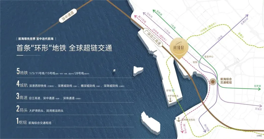 5地铁:距地铁11号线宝安站约800米,毗邻地铁1/5/11号线/15号线(首条“环形”地铁,建设中)/28号线(规划中)