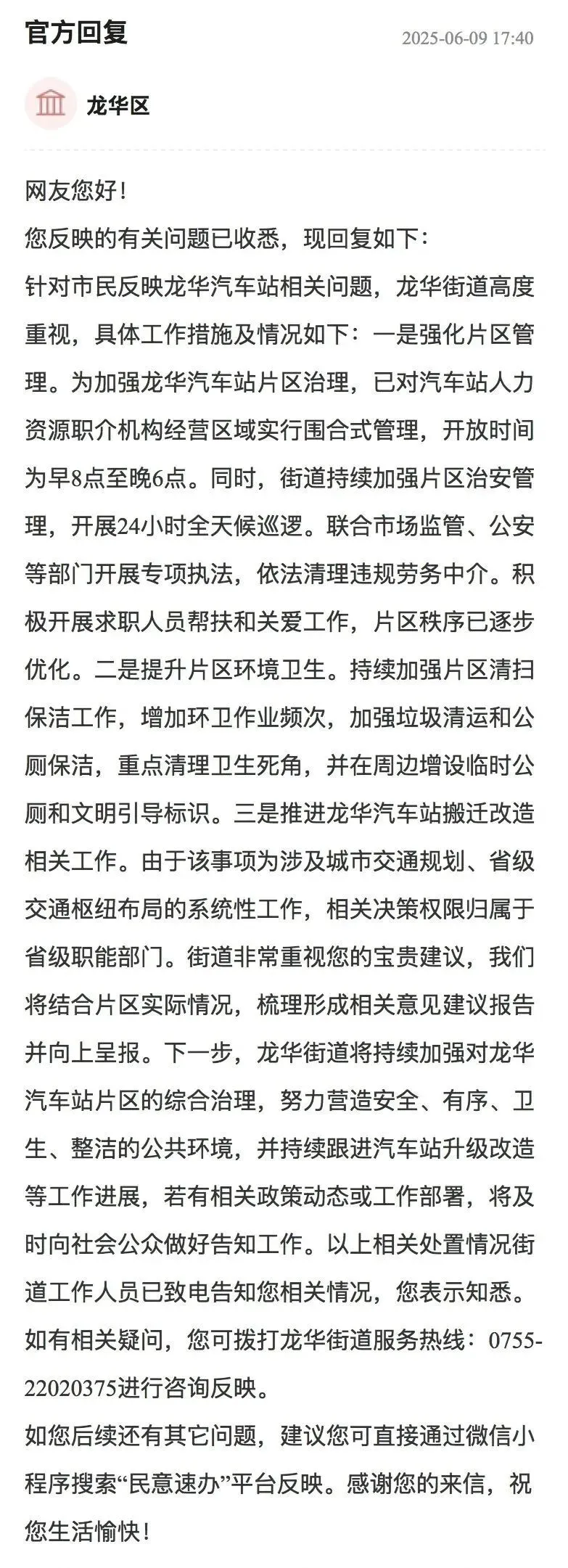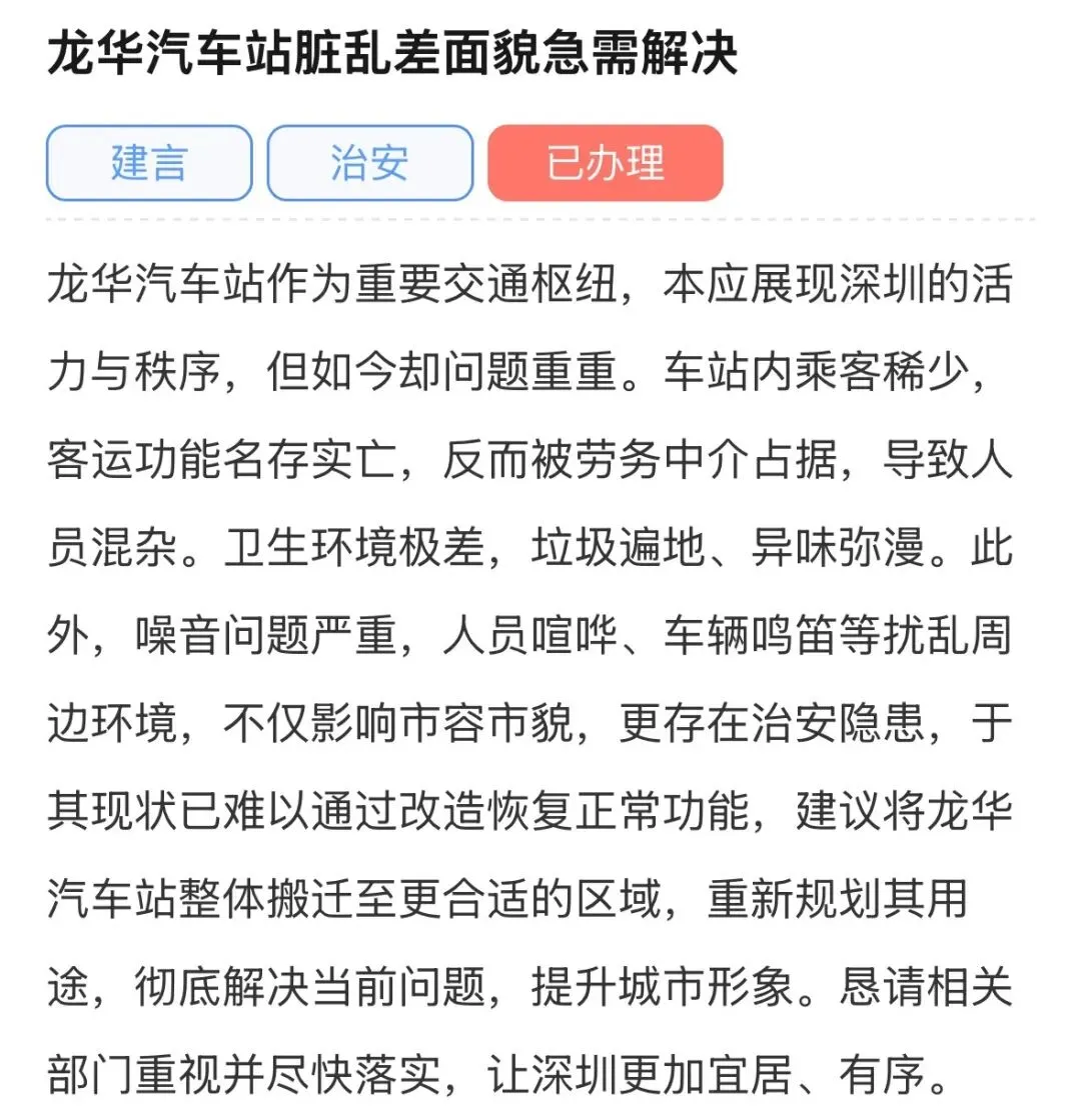 三是推进龙华汽车站搬迁改造相关工作。由于该事项为涉及城市交通规划、省级交通枢纽布局的系统性工作,相关决策权限归属于省级职能部门。龙华街道非常重视该名留言网友的宝贵建议,今后将结合片区实际情况,梳理形成相关意见建议报告并向上呈报。