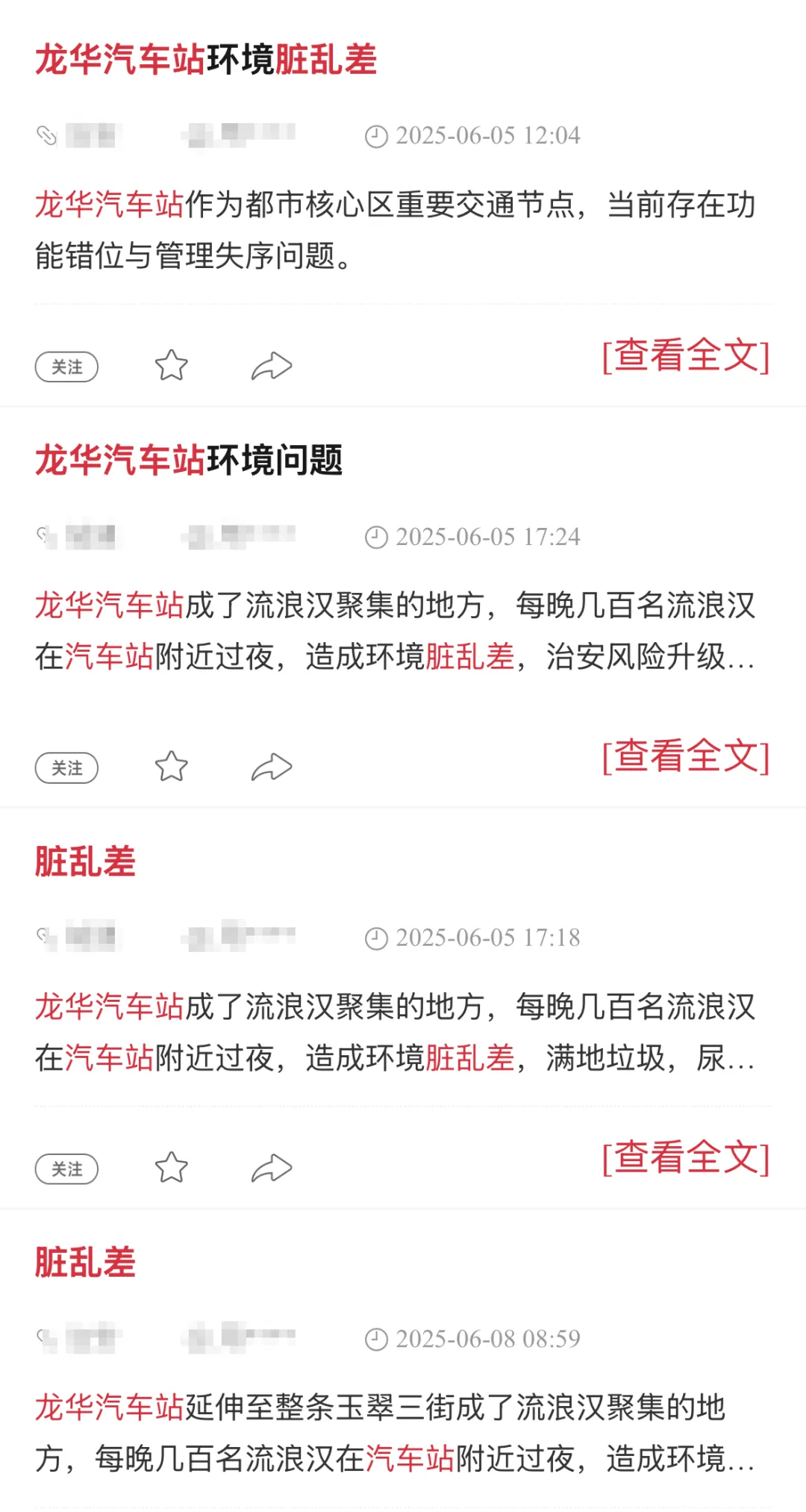 其中,多反映龙华汽车站内人员滞留躺卧现象突出,车站存有环境卫生问题、治安隐患等。