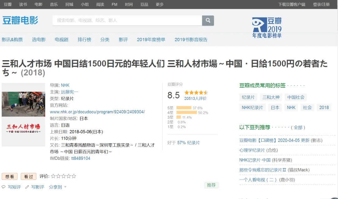 日本NHK播出过一部关于三和大神的纪录片。《三和人才市场:中国日薪百元的年轻人们》,片长110分钟。豆瓣评分:8.4分。