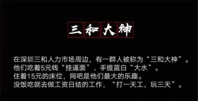 三和大神确实是一批不再困顿于人生意义的人,不困顿的方式也很简单粗暴——直接放弃。经典意义上的三和大神画像是:几番进厂也没攒下什么钱,干脆只做日结,干一天玩儿三天,网吧为家,实在没钱了就睡大街上,之后再去做日结。