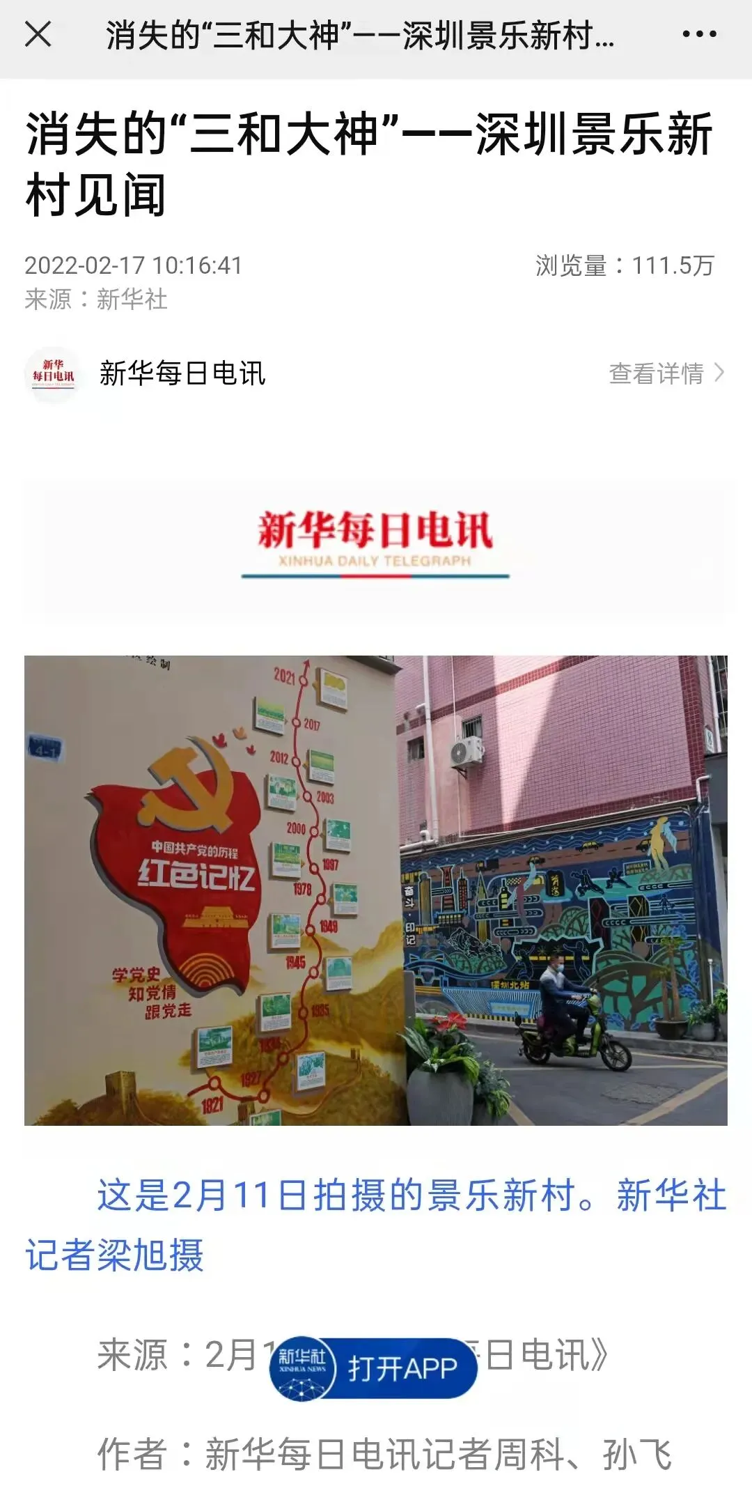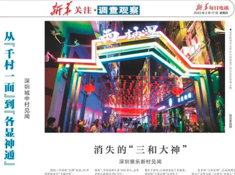 2月17日,新华社《新华每日电讯》以《消失的“三和大神”——深圳景乐新村见闻》为题,报道了春节期间,记者到龙华区景乐新村的走访发现。文章以景乐新村打工者钟杭的故事为切入口,介绍了该片区的蝶变故事,展现了龙华区城中村整治成效以及为就业群体提供的暖心服务。截至2月18日上午9:10,单篇报道阅读量已近111.5万次。
