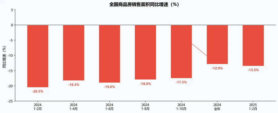 但是,全国数据跟这个不在一个频道。2024年全国商品房销售面积四连跌,2025年前两个月继续跳水 -13.5%。全面回暖?时候没到。