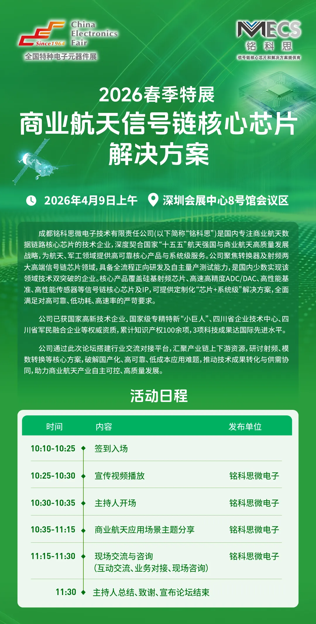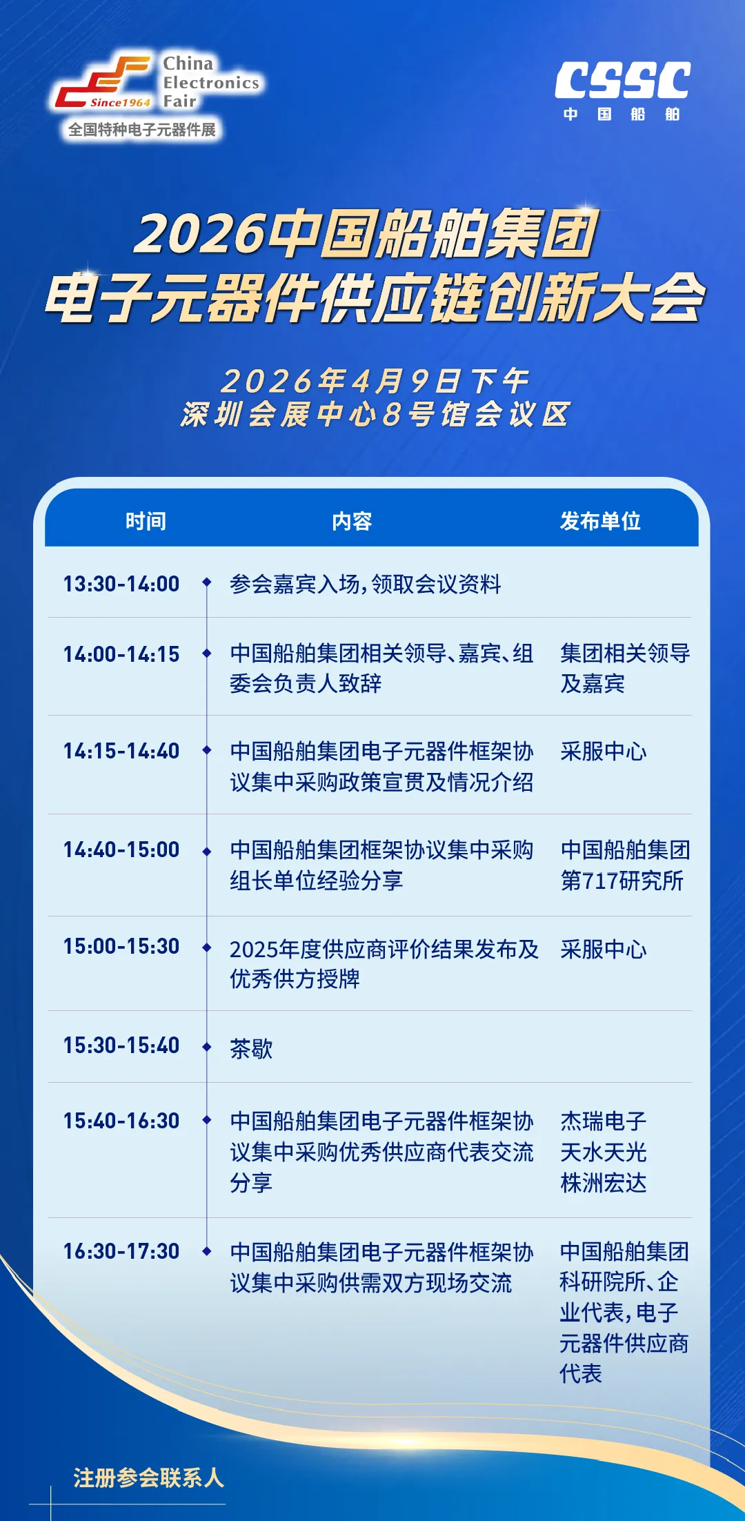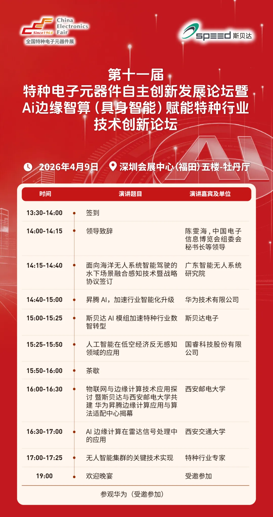 为进一步丰富展会内容,提升展会质量,展会组委会还精心策划组织了四场系列论坛和供需对接活动,其中有4月9号下午在8号馆会议区召开的重点供需对接活动“2026中国船舶集团电子元器件供应链创新大会”,有4月9日下午在深圳会展中心五楼牡丹厅举办的主题论坛“第十一届特种电子元器件自主创新发展论坛暨Ai边缘智算(具身智能)赋能特种行业技术创新”,同期还有新品发布会、特种电子上市公司闭门会等多场形式多样的供需对接活动等。