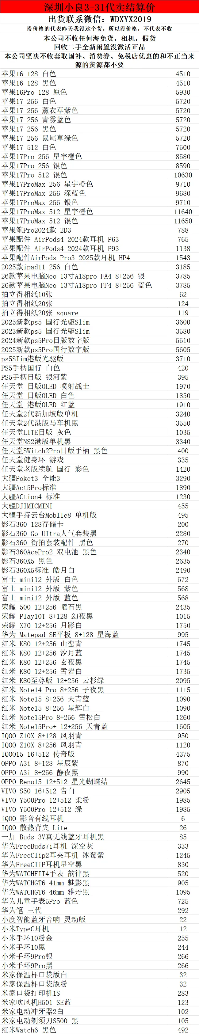 >深圳小良2026.3.31电子产品代卖结算价(美妆价格小程序查看)