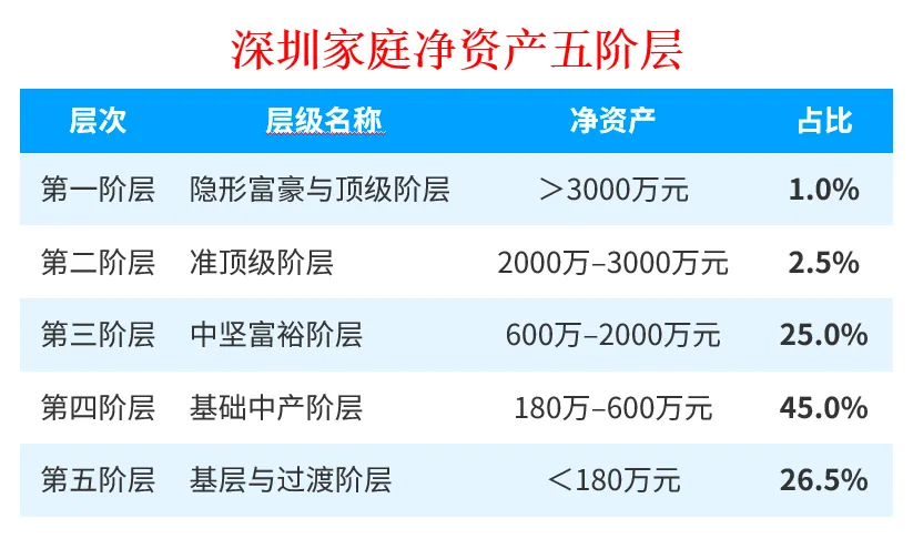 基于净资产规模、资产构成及抗风险能力,将深圳家庭分为五个阶层。