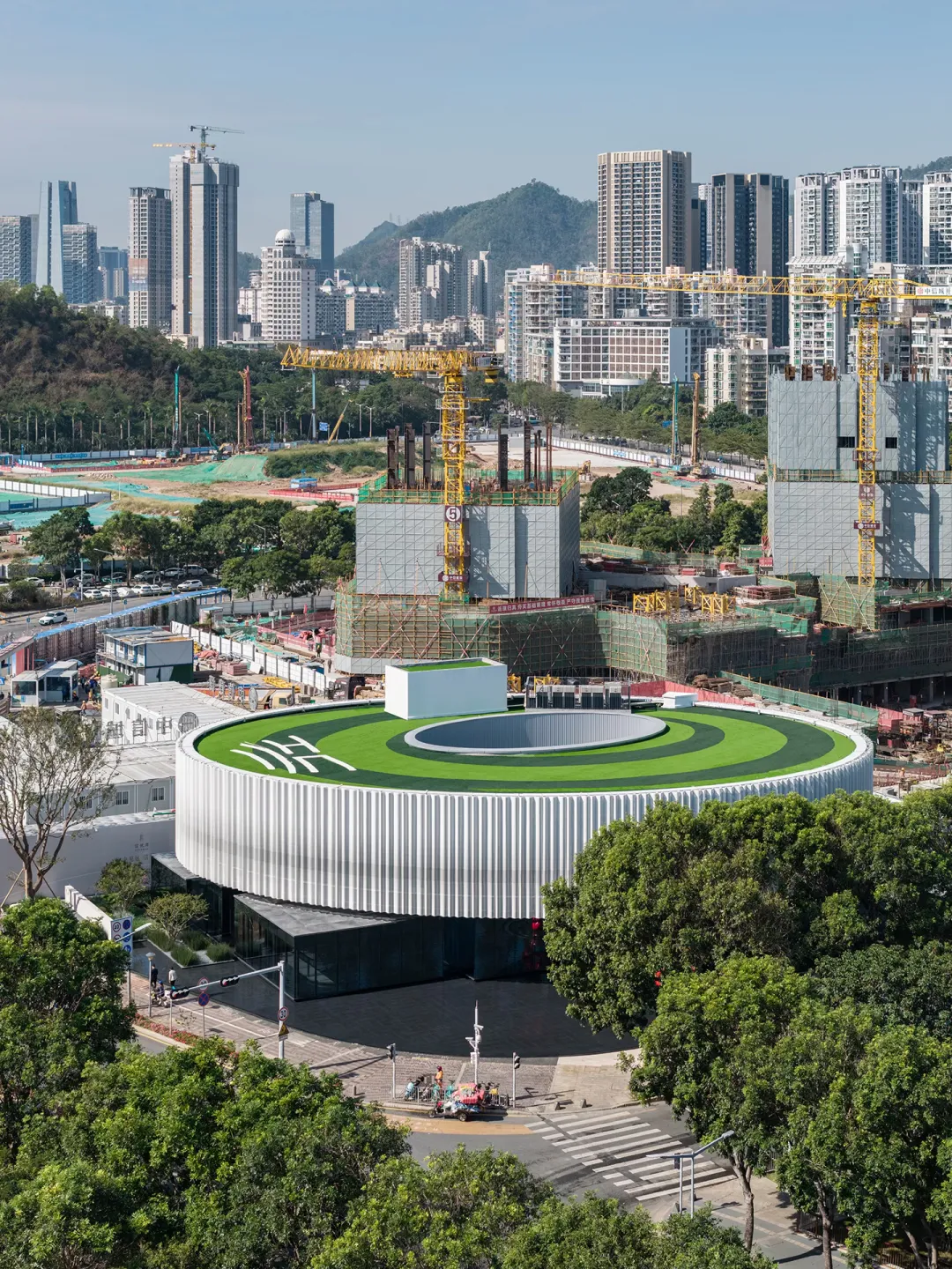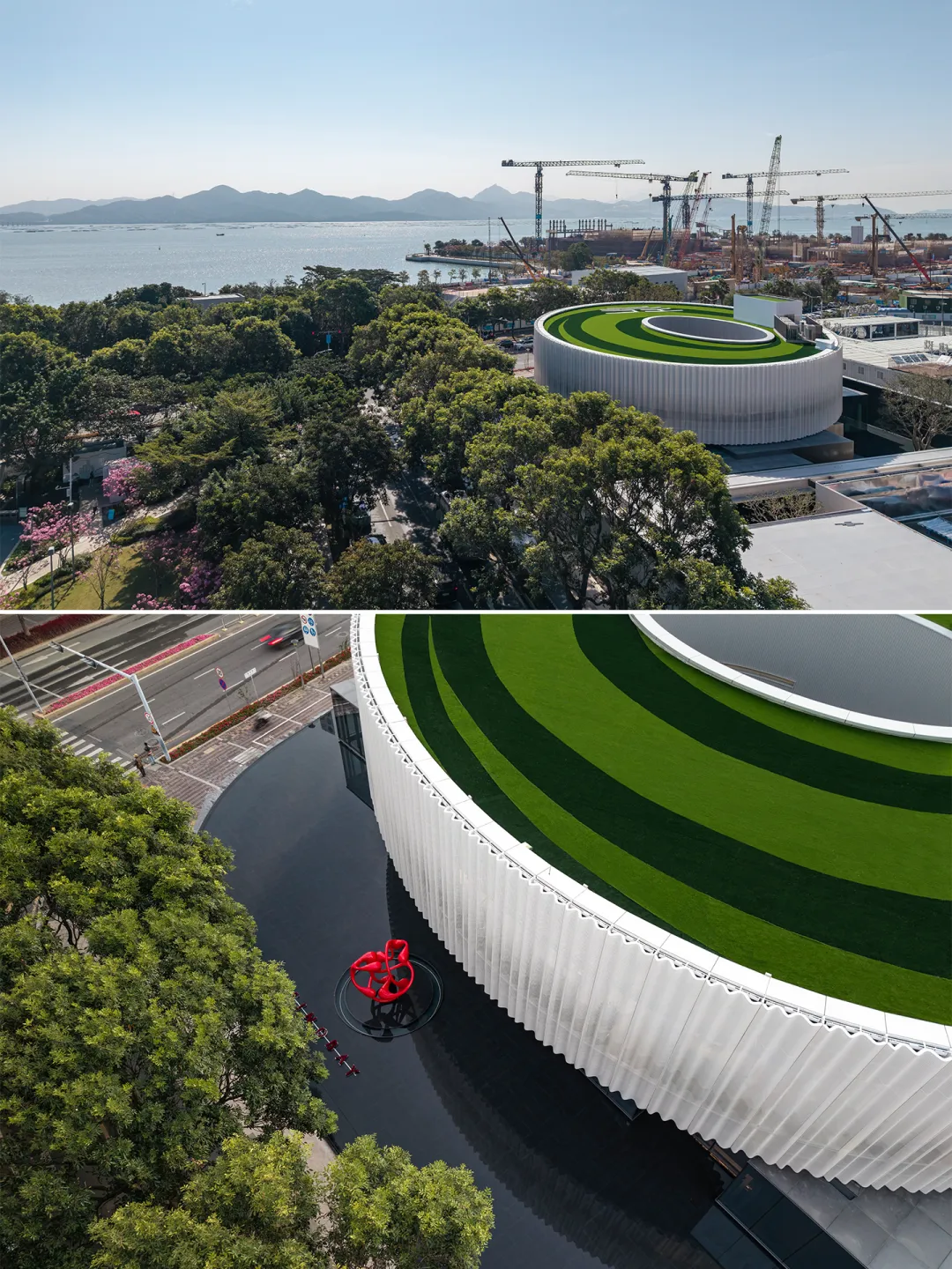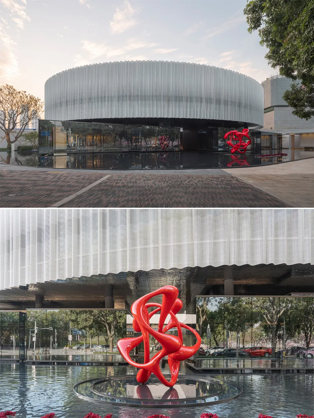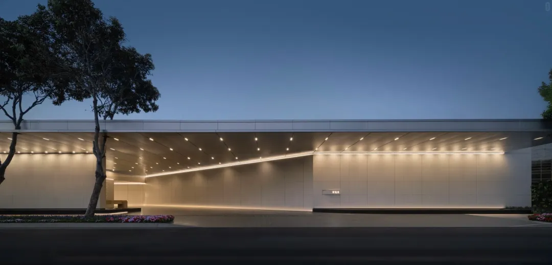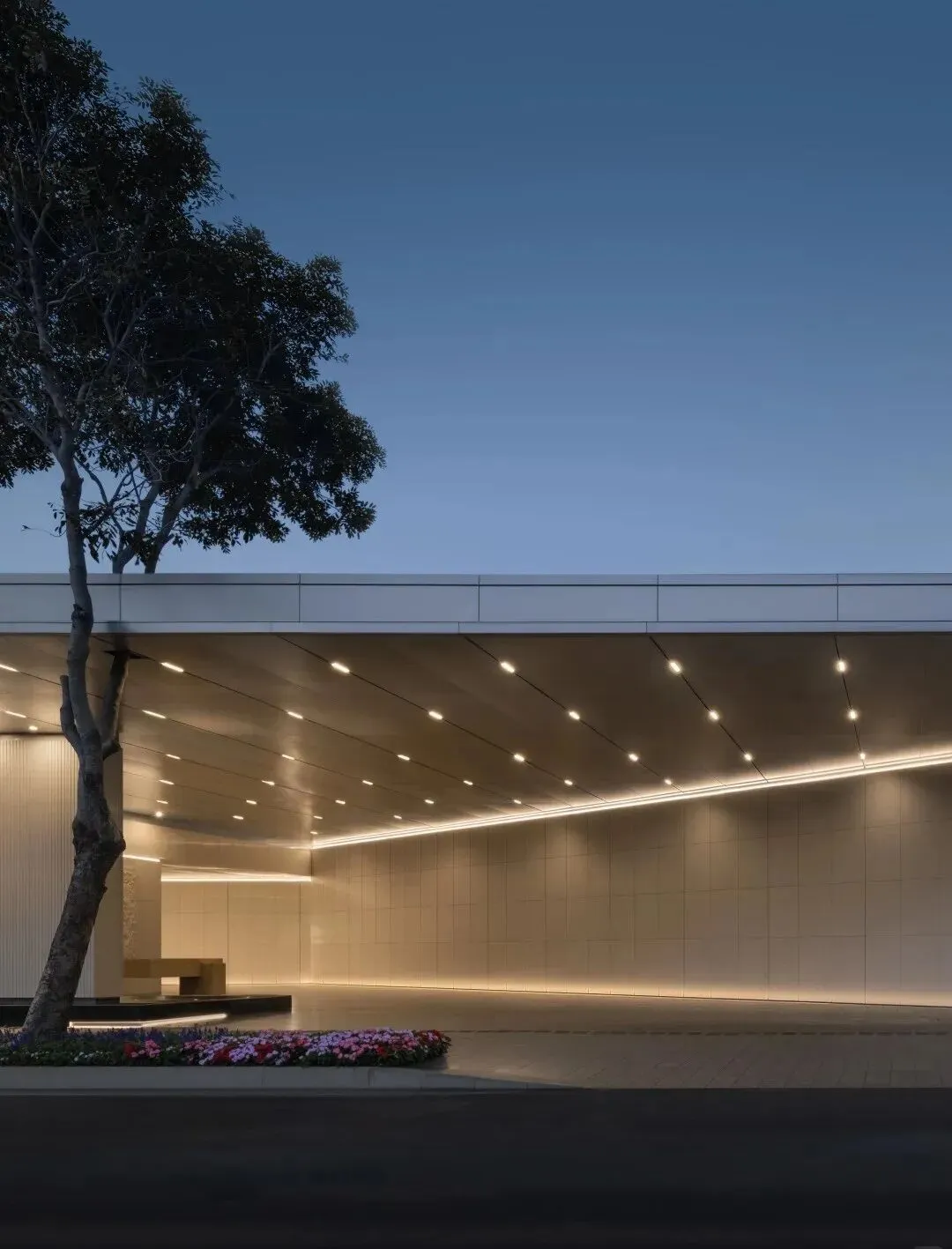 售楼部外立面延续了项目整体的“海浪风帆”曲线语言,采用曲面玻璃搭配铸铝线条,质感通透又极具张力。12米挑高架空+无柱式设计,弱化了建筑与自然的边界,站在远处望去,仿佛一座漂浮在海边的艺术展馆,与不远处的深圳歌剧院形成诗意呼应。