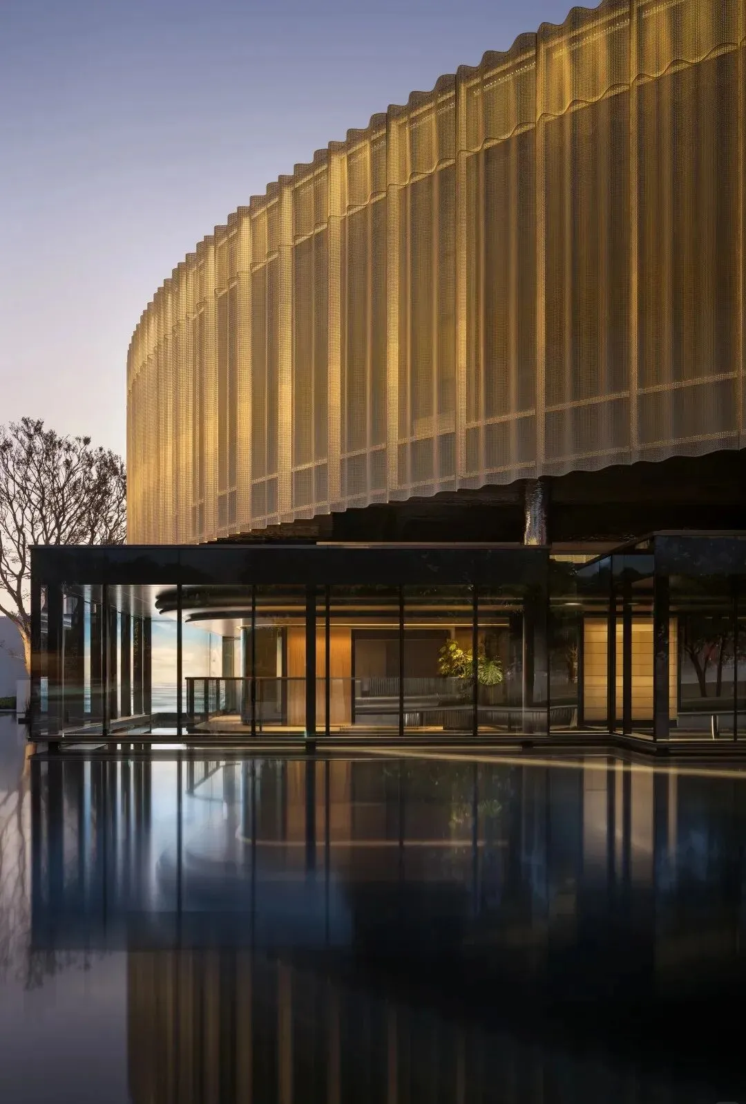 材质上,选用砂岩质感石材与金属铝板,通过水平层叠的线条,模拟海浪拍击岩石的自然肌理,既适配滨海气候的抗腐蚀需求,又让建筑在阳光下呈现出层次丰富的质感,辨识度拉满。