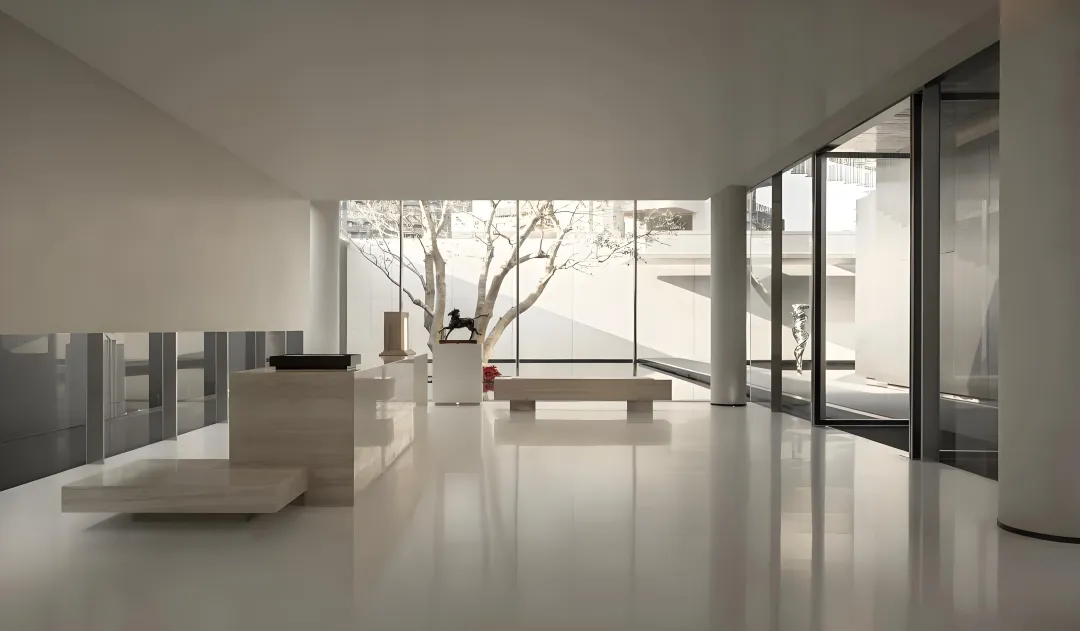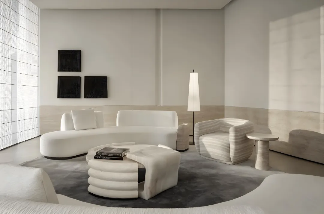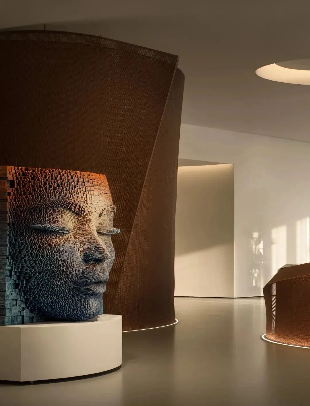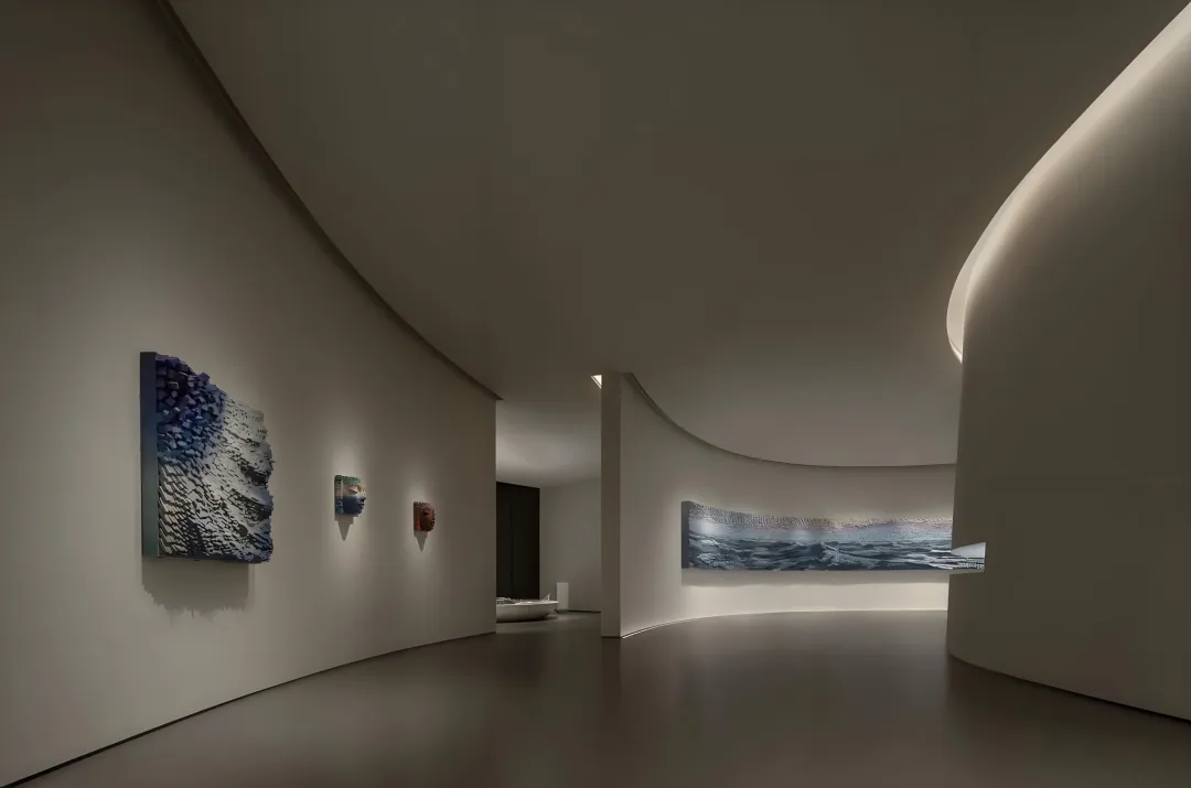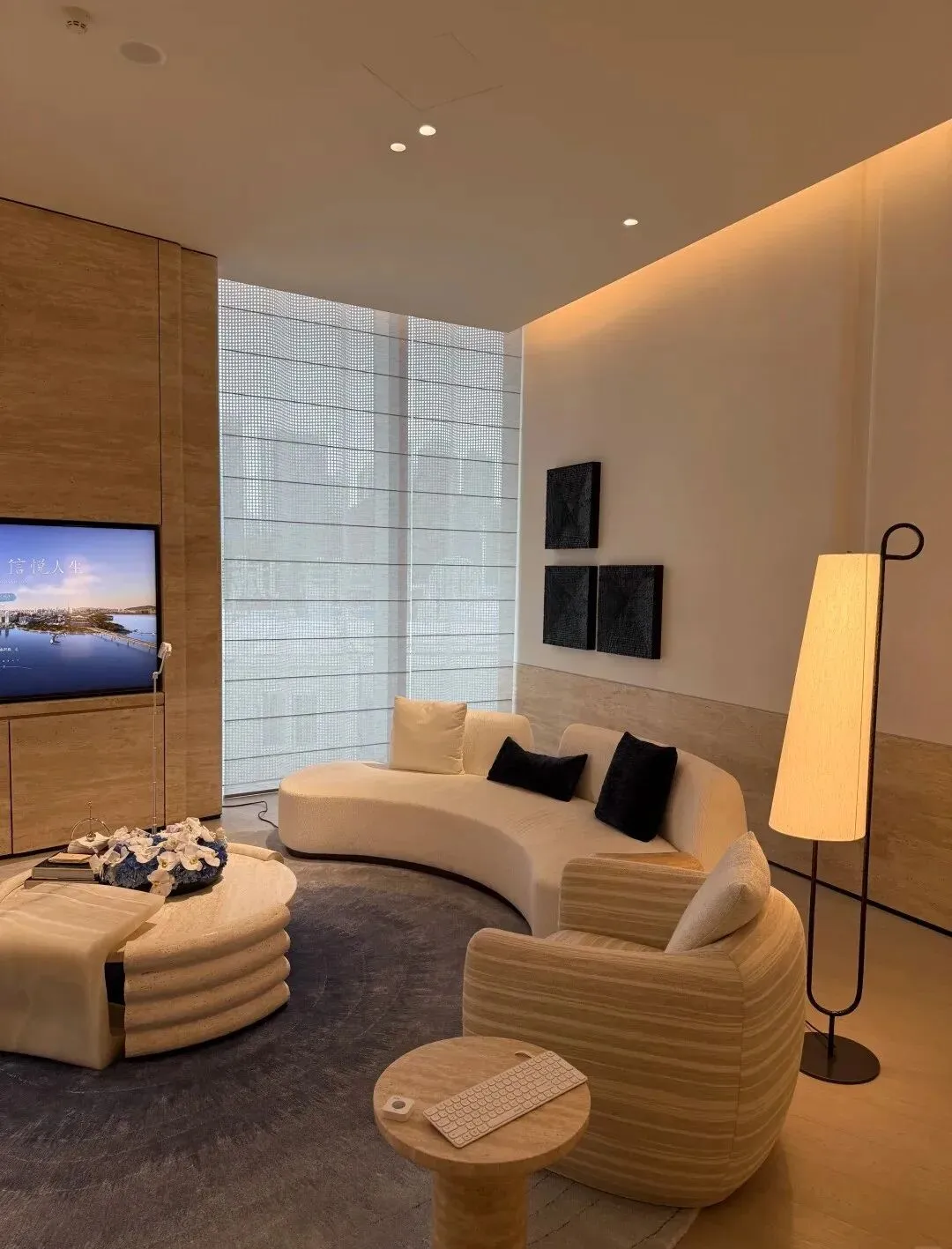 走进售楼部,最先感受到的不是销售氛围,而是满满的艺术感与通透感。整个空间以“270°环幕观海+艺术藏品馆”为核心,暖调漫射光柔和包裹,低饱和度的软装搭配艺术摆件,让海景成为空间的主角。