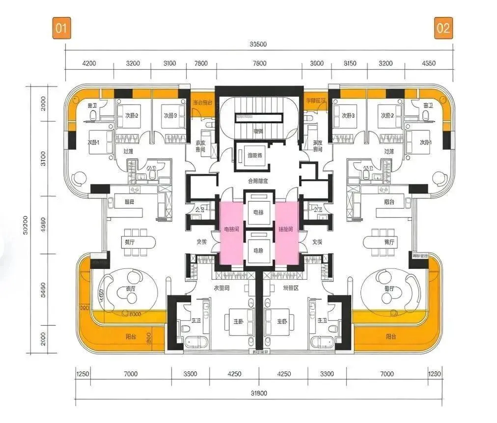 梯户比3梯2户,层高3.5米,西南向无遮挡俯瞰海景与深圳歌剧院,是项目的主力户型。双套房+家政间设计,适配多孩家庭或三代同堂居住;私家电梯厅入户,归家仪式感拉满;约12米超大观景面,客厅与主卧双瞰海,空间尺度奢阔,无论是家庭聚会还是私人宴请,都能尽显尊崇。