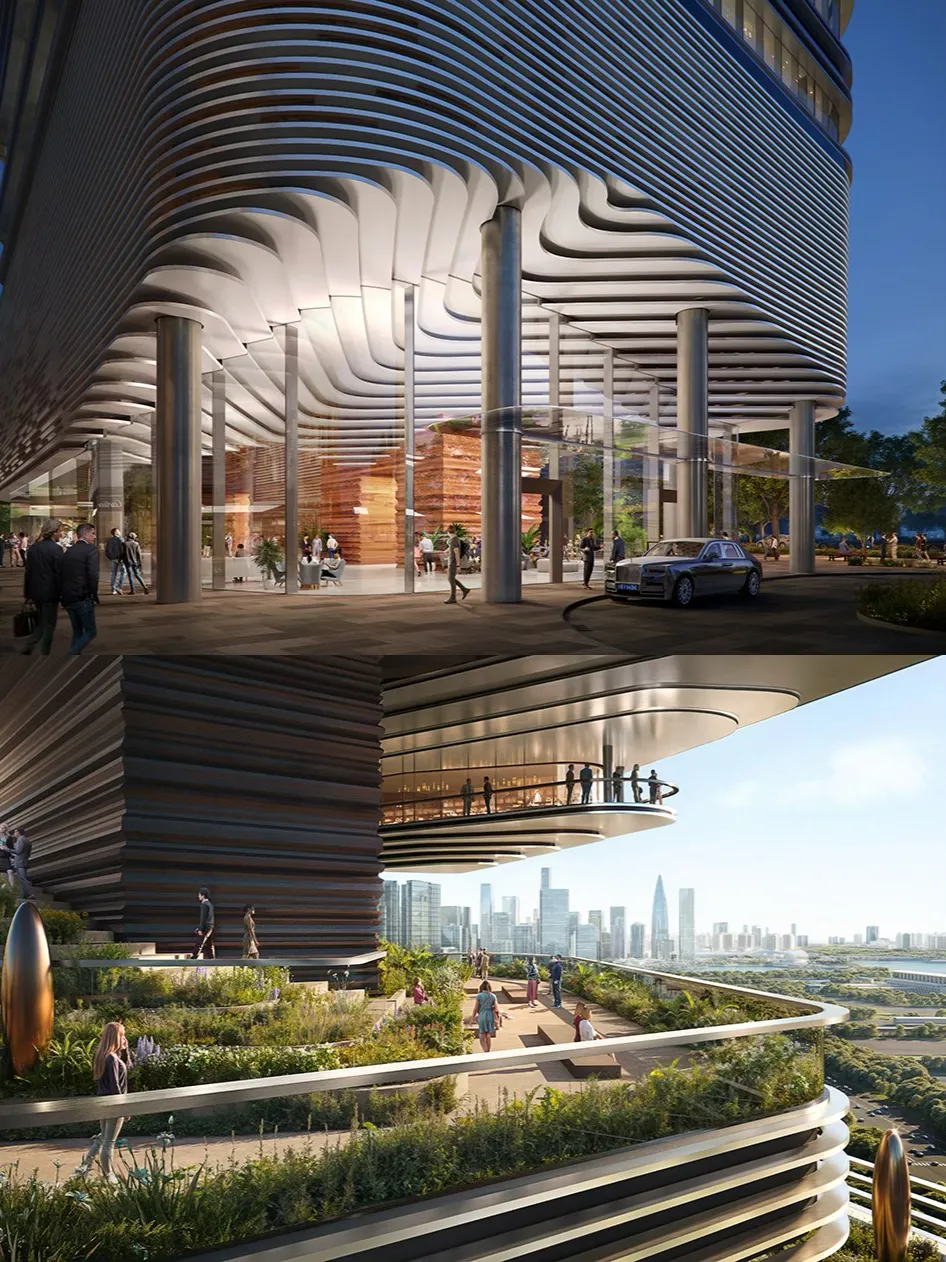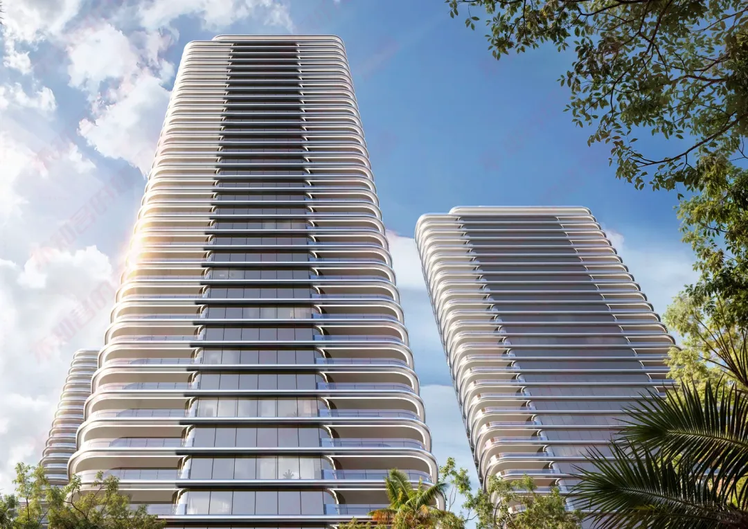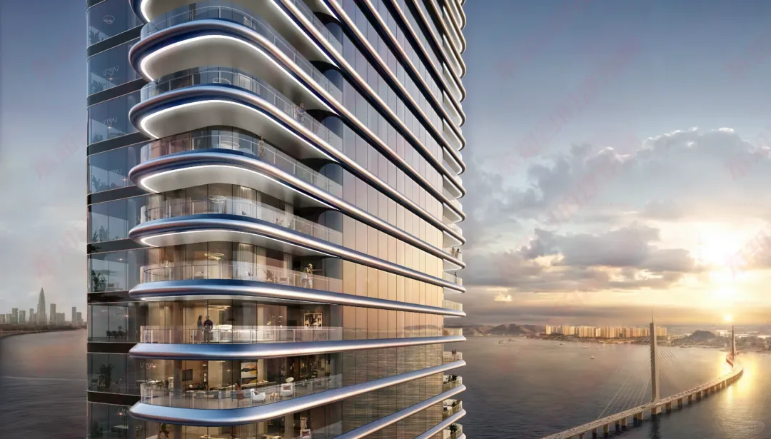 建筑立面以“海浪风帆”为灵感,采用现代极简风格,柔和的曲线造型与深圳歌剧院形成呼应。作为深圳首个采用铸铝工艺的住宅,铸铝幕墙搭配曲面玻璃,不仅质感出众,更兼具耐久性与滨海抗腐蚀性;塔楼海景面采用落地单元式幕墙,最大化窗地比,开启扇为落地平推窗,既优化了观景体验,也提升了通风效果。