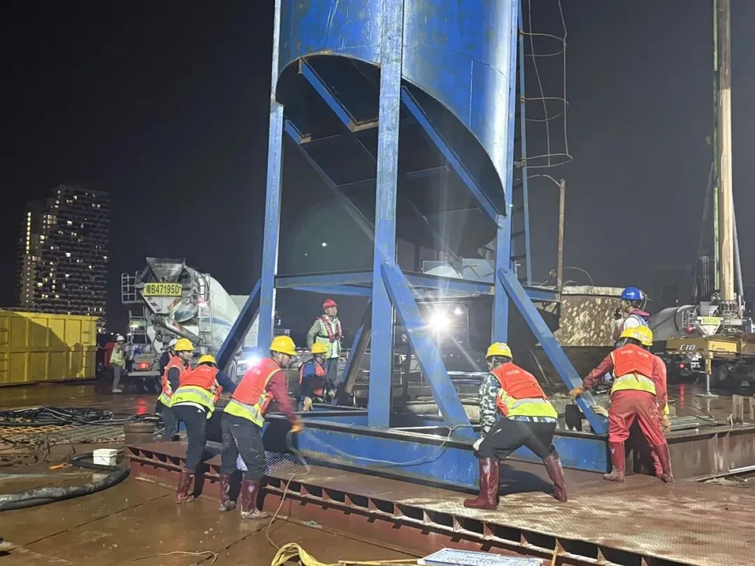项目部采用护筒串联兼作泥浆储浆池,大幅提升泥浆存储与循环效率;钻渣采用渣箱集中堆放,并在掏渣区周设花纹钢板全封闭防护,严防钻渣入海;废弃泥浆与钻渣每日安排专车密闭清运,同时现场出入口设置洗车台与沉淀池,场内道路每日洒水降尘并对临时堆放裸土进行覆盖。针对噪声控制,严禁夜间甩钻头或采用截齿钻作业,全方位落实绿色精细化施工。项目管理人员全程跟班作业,每道工序严格执行“举牌验收”制度,确保责任落实到人,施工安全高效推进。