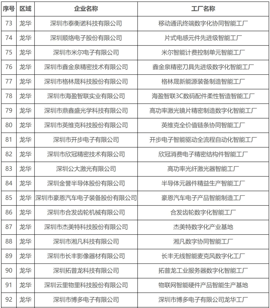 深圳市先进级智能工厂(2026年第一批)名单