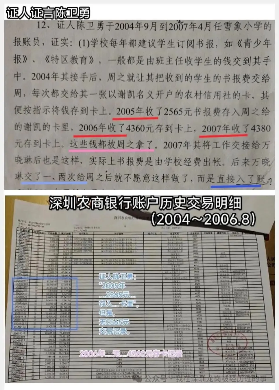 1、证人陈卫勇证言2005年2565元、2006年4360元存卡(证据2),但是该卡深圳农商行账户历史交易明细(2004~2006.8)没有这两笔存卡记录(证据3——新证据)。证明陈卫勇伪证。