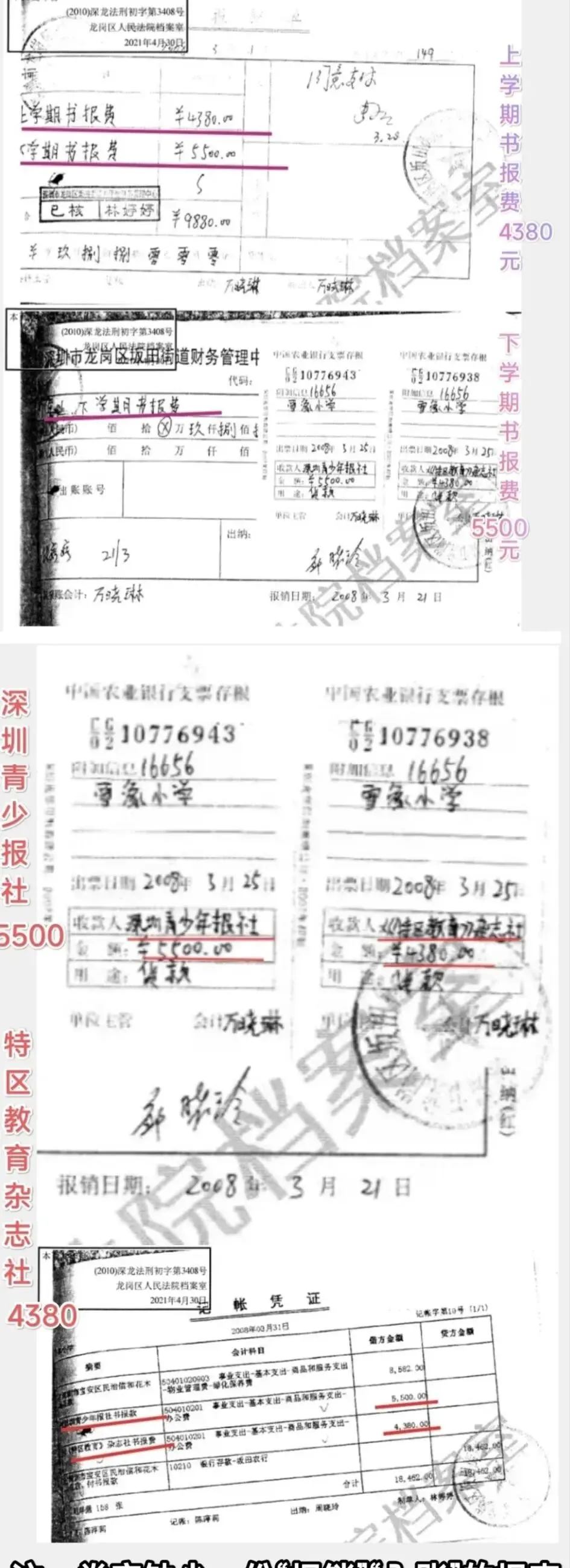综合物证书证“2008年…9880元”,证明深圳市龙岗区法院、审判长刘招华、证人陈卫勇和万晓琳,共同伪造证据、编造校长犯罪事实。