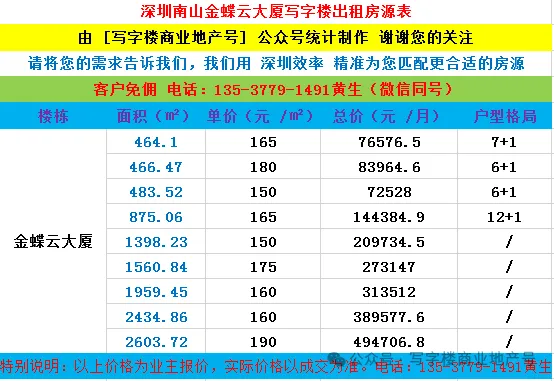 深圳南山科技园地铁金融科技大厦写字楼办公室租赁出租房源销控表